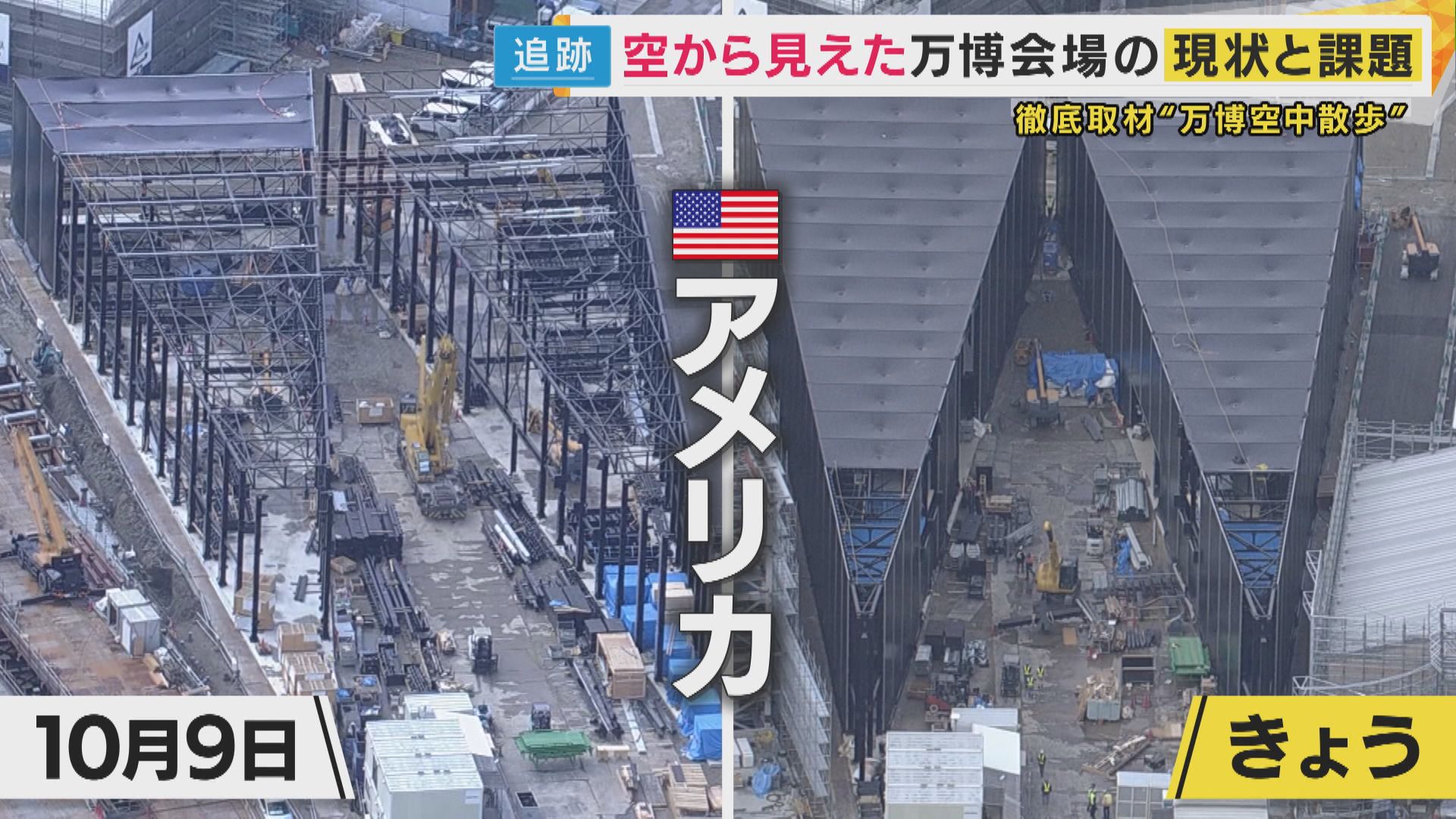 【記者リポート】「万博の会場の中でも、かなり大きなパビリオンを建設しているアメリカですが、先月までは黒色の骨組みしかありませんでしたが、いまは壁でおおわれていて、屋根もついている状態です」