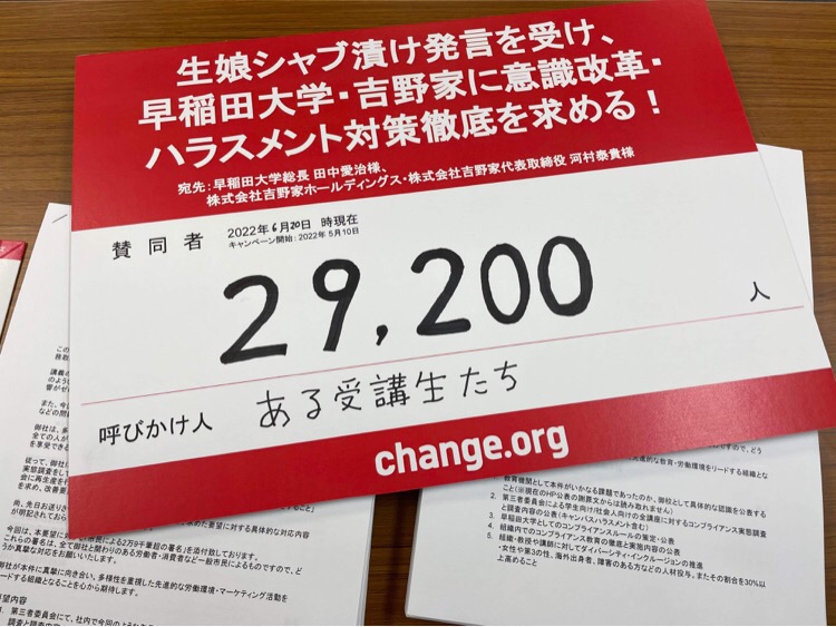 最終的に2万9200人が賛同し署名。Aさんは、6月20日、吉野家と早稲田大学に提出した。