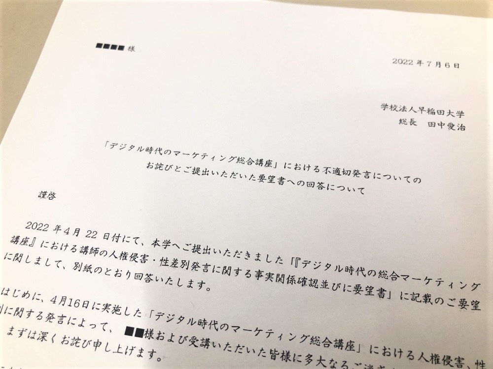 一方で「教室は公の場ではない。講師の一言一句のチェックは大学側にはできない」と言われました。