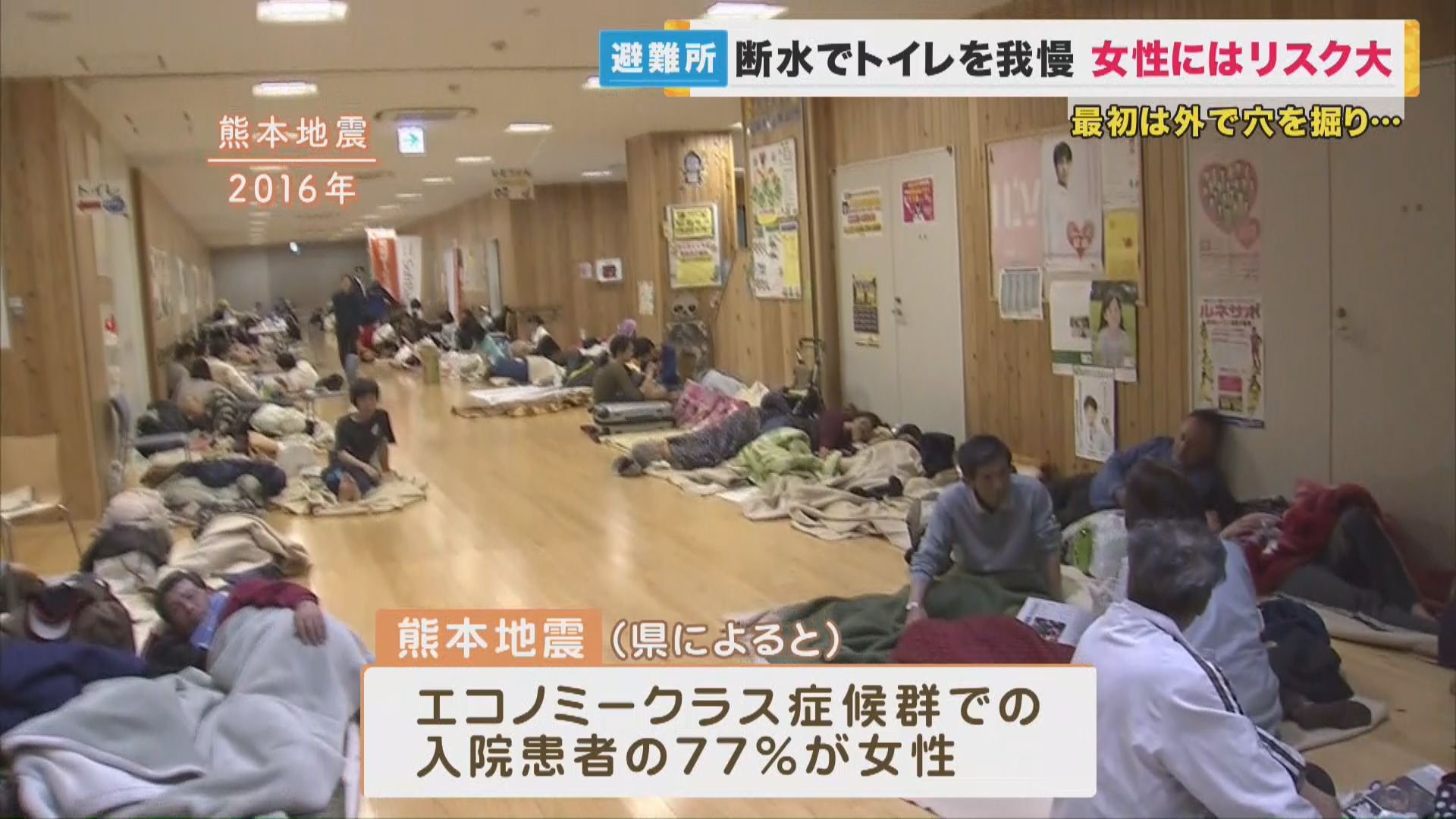 2016年の熊本地震では、エコノミークラス症候群で入院した人の約8割が女性でした。トイレの回数を減らすため、水分をとらないようにして、血栓ができやすくなっていたとみられます。さらに女性はぼうこう炎になりやすく、重症化するリスクも高いといいます。