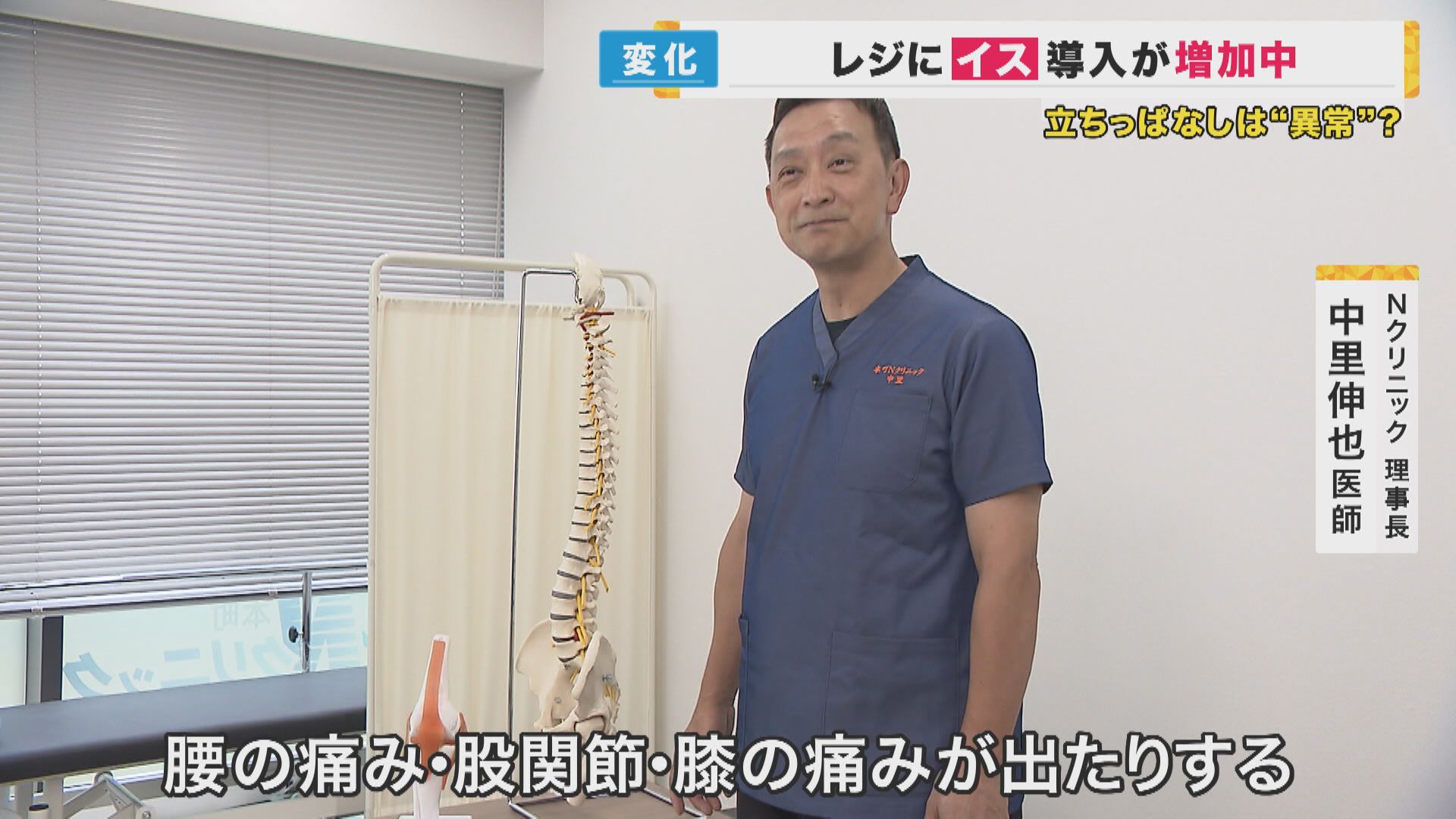 【Nクリニック理事長 中里伸也医師】「立ちっぱなしでいると、上半身の重さがそのまま腰や骨盤にかかってしまいますので、腰の痛みが出たり股関節・ひざの痛みが出たりする。ずっと立ち続けるということは、ある筋肉ばかり使うので、その使われた筋肉は疲労に陥りやすくなる」