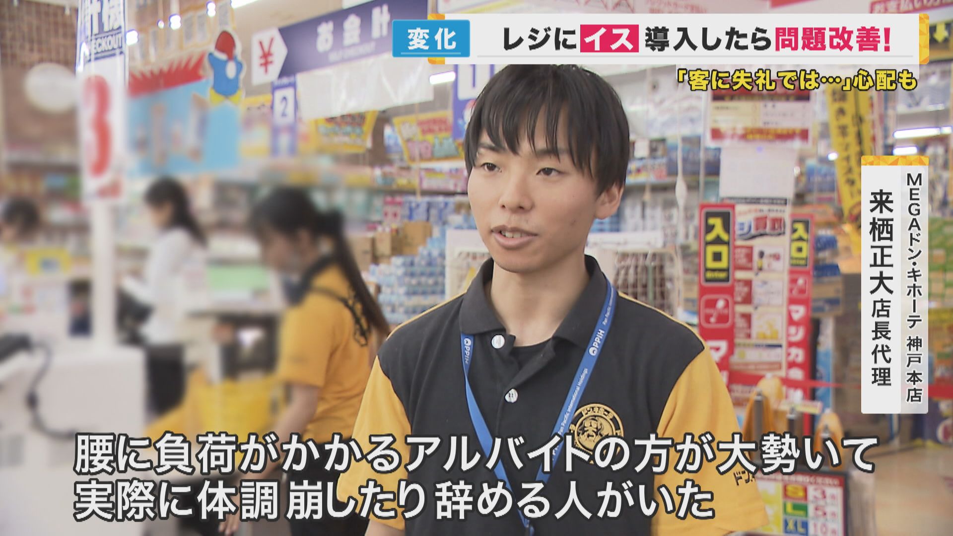 【MEGAドン・キホーテ神戸本店 来栖正大店長代理】「腰に負荷がかかるアルバイトの方が大勢いて、実際に体調崩したり、辞める人がいた。イスを導入する前より、そういった理由で辞めるスタッフは少なくなった。(求人の)プラスの要素にはなると思う。打ち出していけたらなと思います」