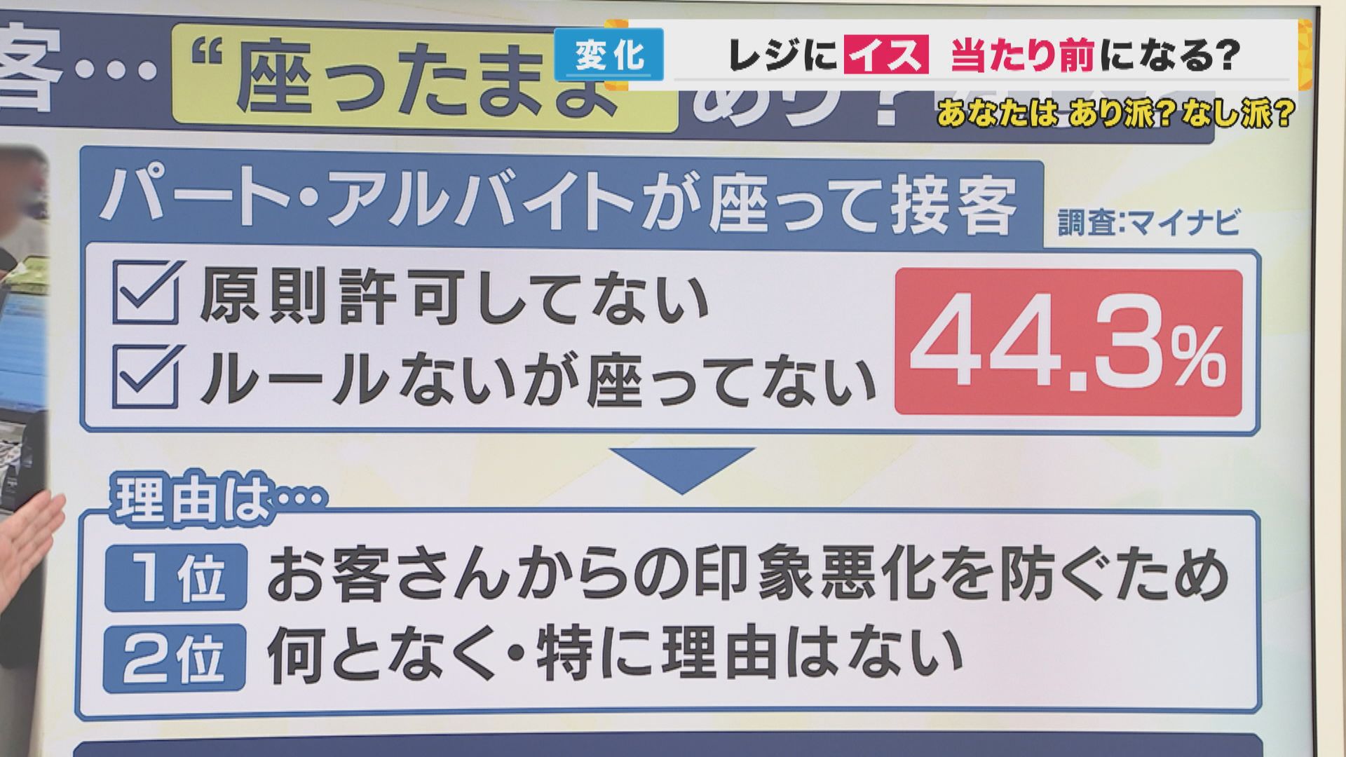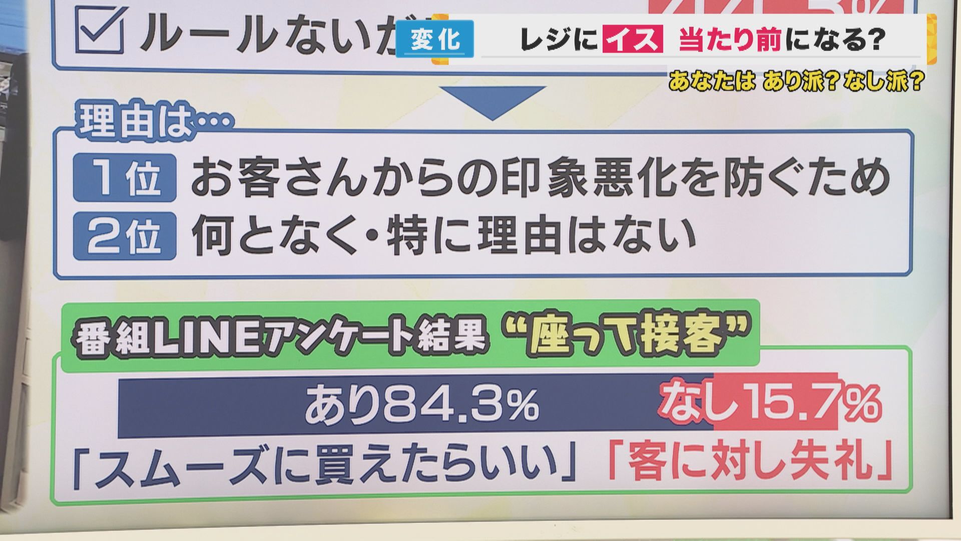 一方で、サービスを受けるお客の立場ではどうなのか?事前に番組のLINEでアンケートを取ったところ、座って接客が「あり」は84.3%、「なし」は15.7%でした。