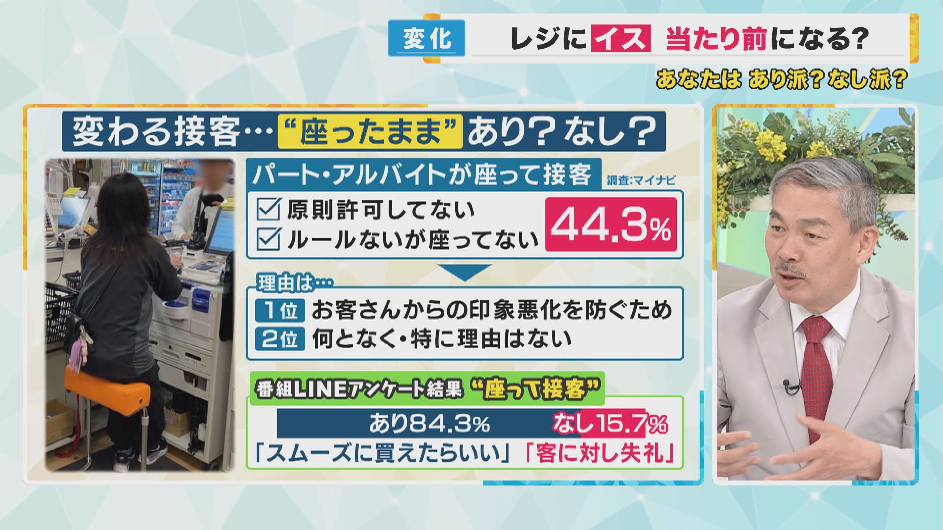 【関西テレビ 神崎博報道デスク】「経営者側としてはそう思うけれども、実は利用者側の番組のLINEアンケートの結果ではそこまで思ってということなので、もしかしたらギャップがあるかもしれませんし、一方で働く人の側から見ると、例えばですけど今、接客業の募集をかけてもなかなか人が集まないと聞きますので、労働環境を少しでも良くしていけば、立ち仕事ではなく座れるということになれば、働いてみようかという人が出てくるかもしれません。労働環境も考えると、座るというのは、アリなんちゃうかなとは思います」