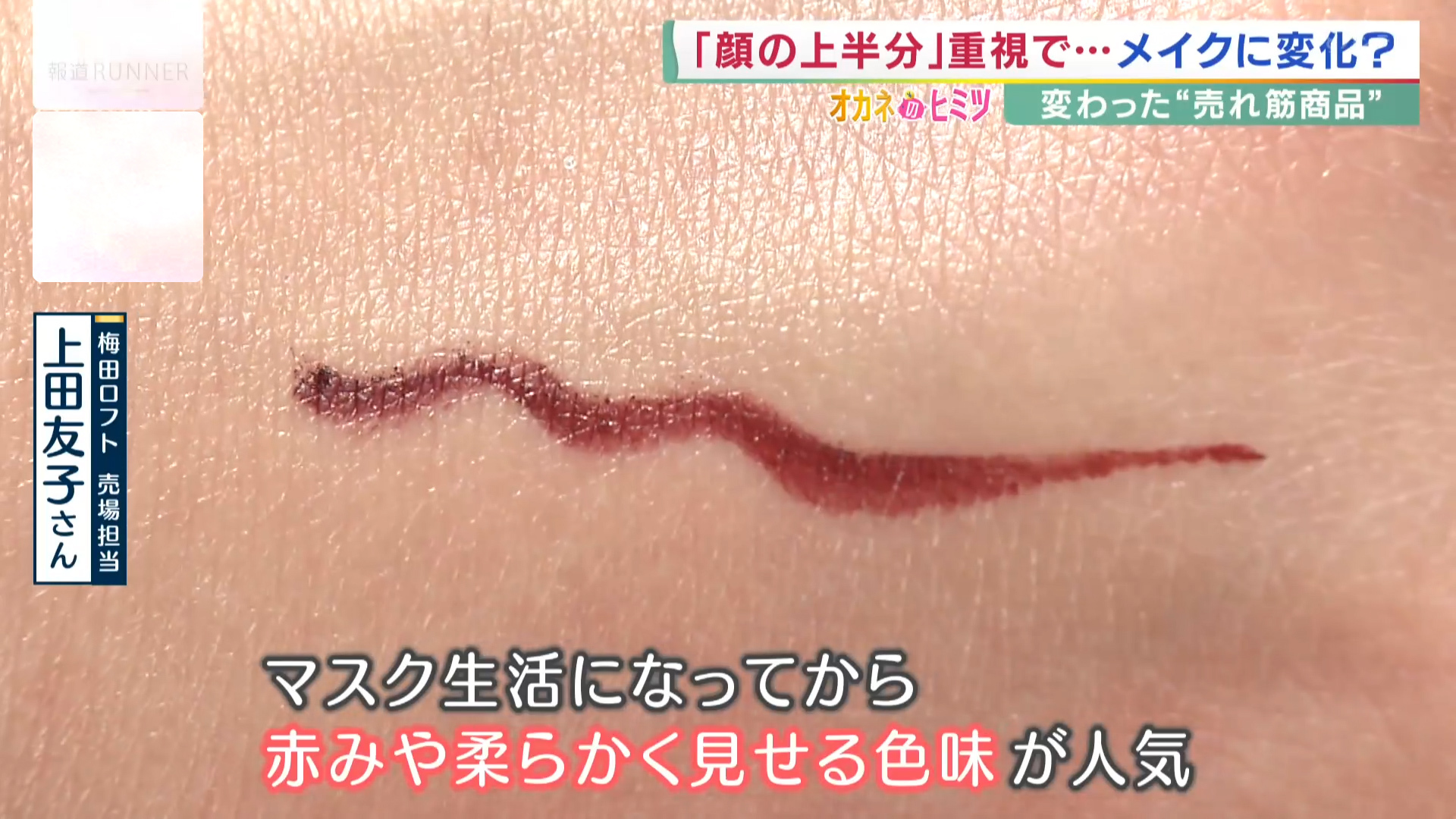 他にも、マスカラやアイブロウ、アイシャドウでも暖色系の種類が増えていて、こうした目元メイクはコロナ前と比較しても売上を伸ばしているようです。