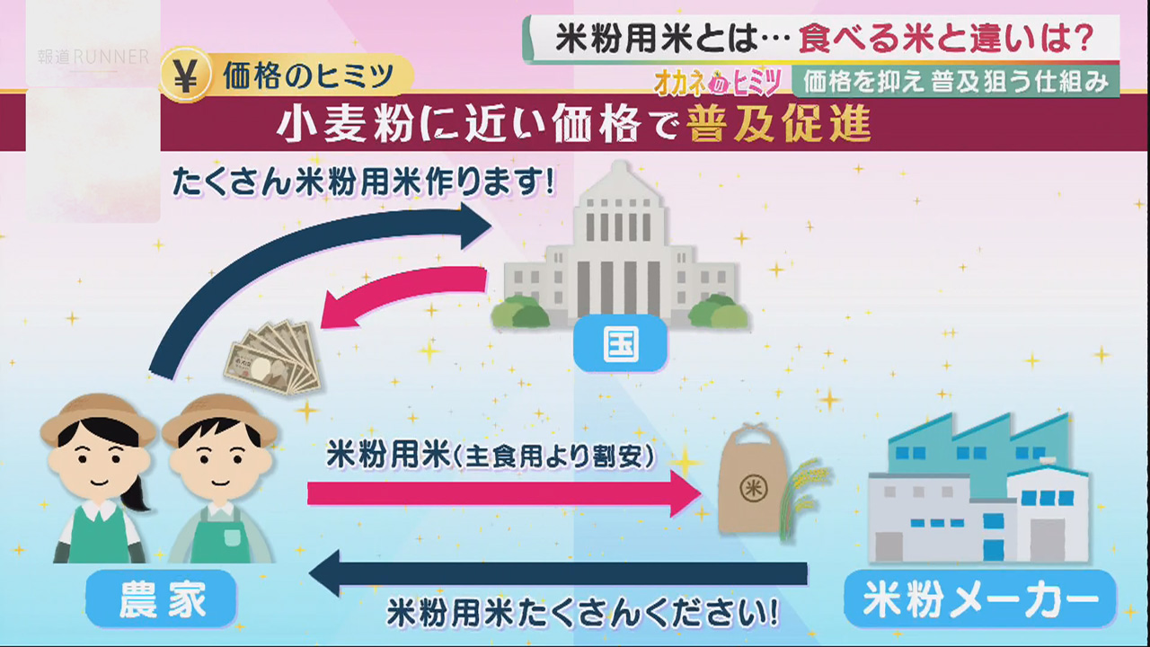 米を米粉用に生産する農家には国が交付金を出して、その分卸値を抑えてもらうことで、原材料コストを削減。割高になる米粉の流通価格を、小麦粉に近づける仕組みなんです。