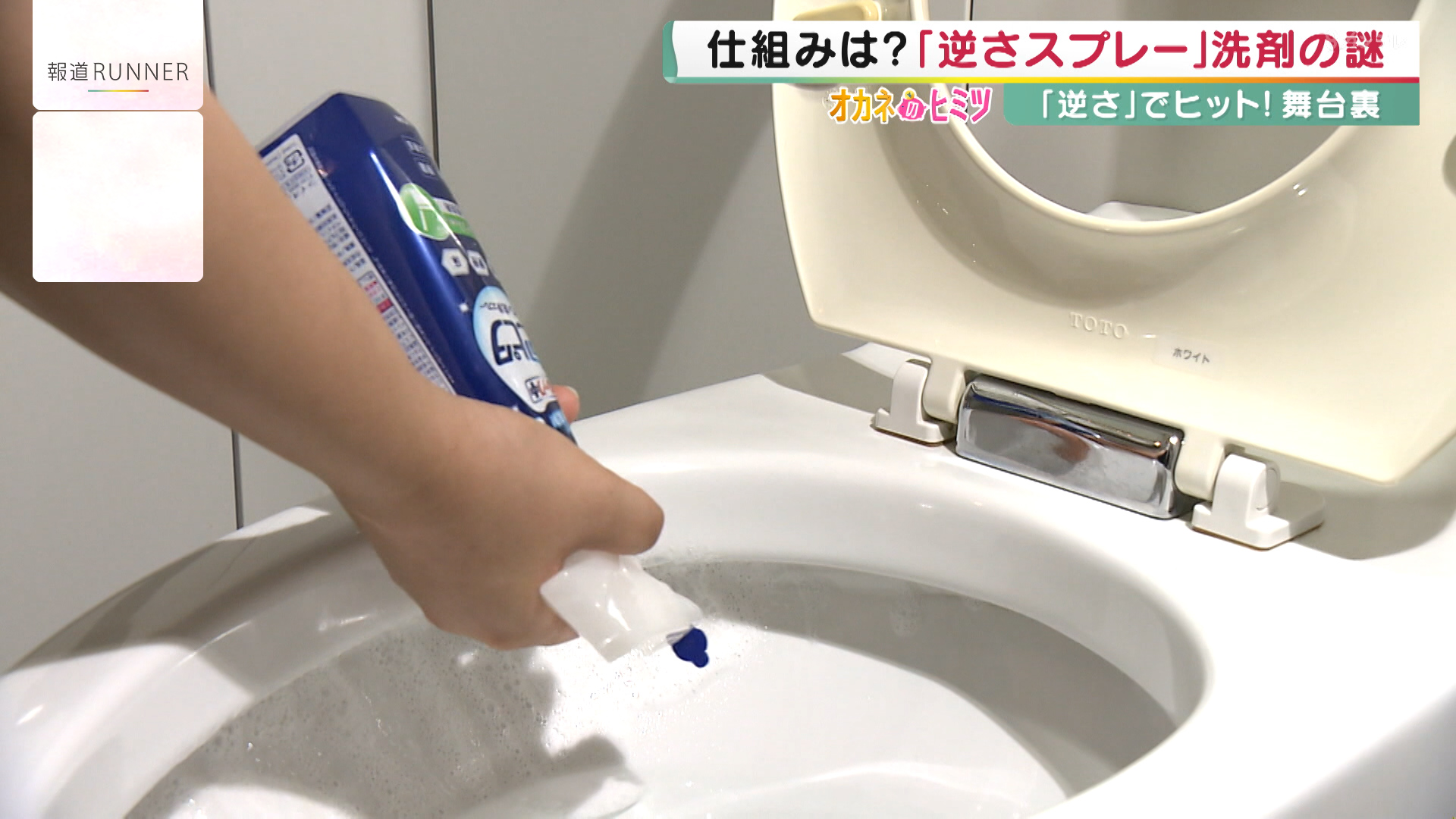 洗いにくい便器の縁裏にスプレーし、こすらずに洗える簡単さが特徴で、逆さにしても洗剤が液だれしないんです。