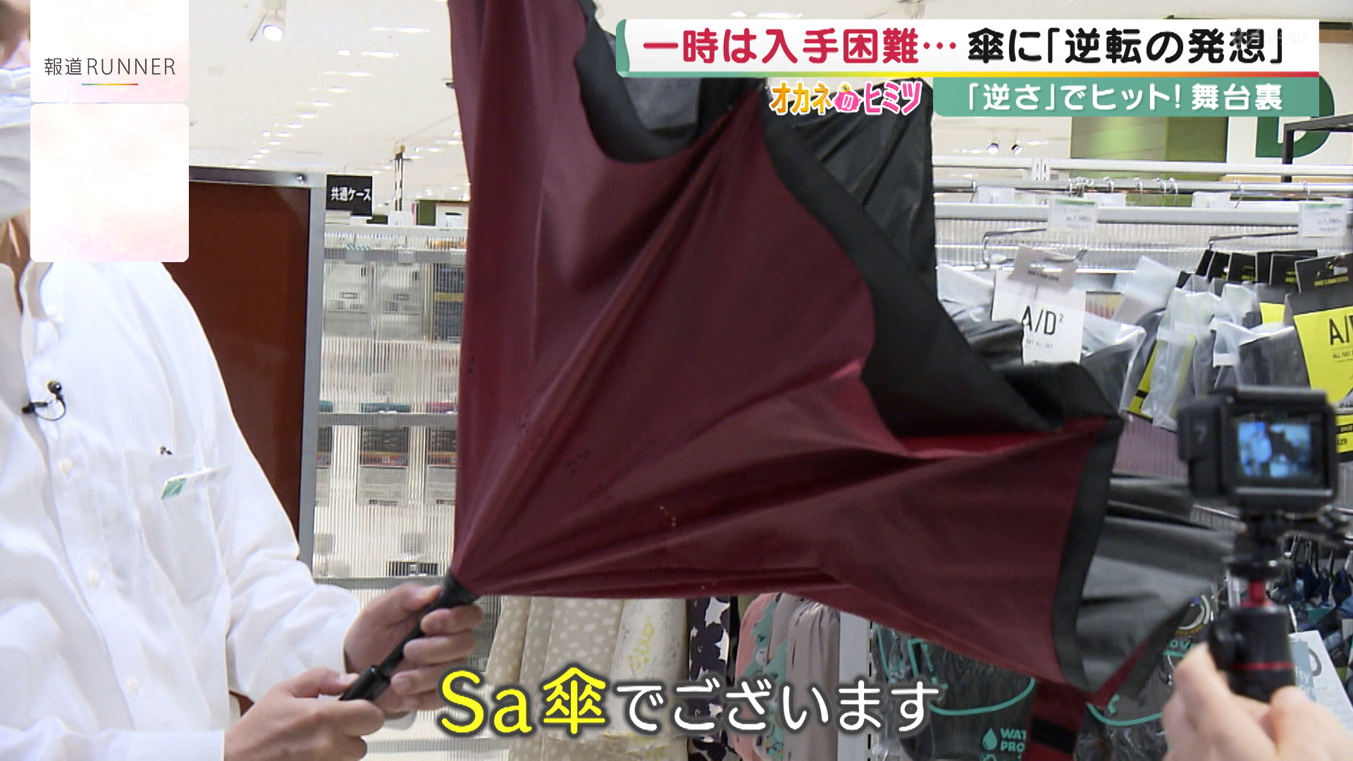 「こちらが『Sa傘(さ・かさ)』でございます。大きな特徴は、畳んだ時に内側が外に来ますので、畳んだ後の外側がぬれていないんです。ですので例えば服に当たったりとか、満員電車で相手の方をぬらしちゃったりとか、その心配が一切ないんです」