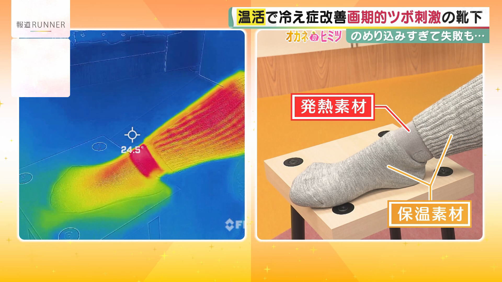 サーモグラフィーを使って見てみると一目瞭然。足首の部分だけ温度が高くなっているのが分かります。ここには発熱素材が使われていて、あえて周りとの温度差を作ることで「三陰交」を刺激。足全体を温めてくれるそうです。