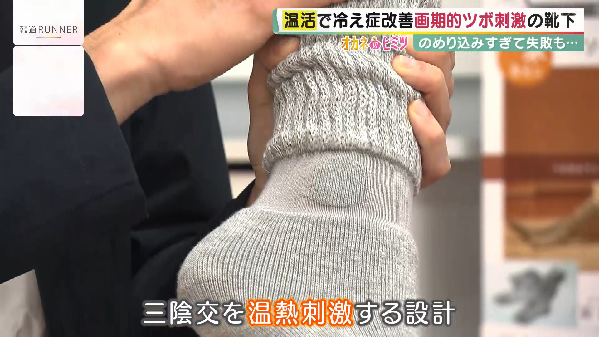 「足首の部分が他とは違うポイントになってます。くるぶしの内側から指4本分くらい上のところに『三陰交』というツボがありまして、東洋医学の中でも冷えに効くと言われていて、その部分を温熱刺激する設計です」