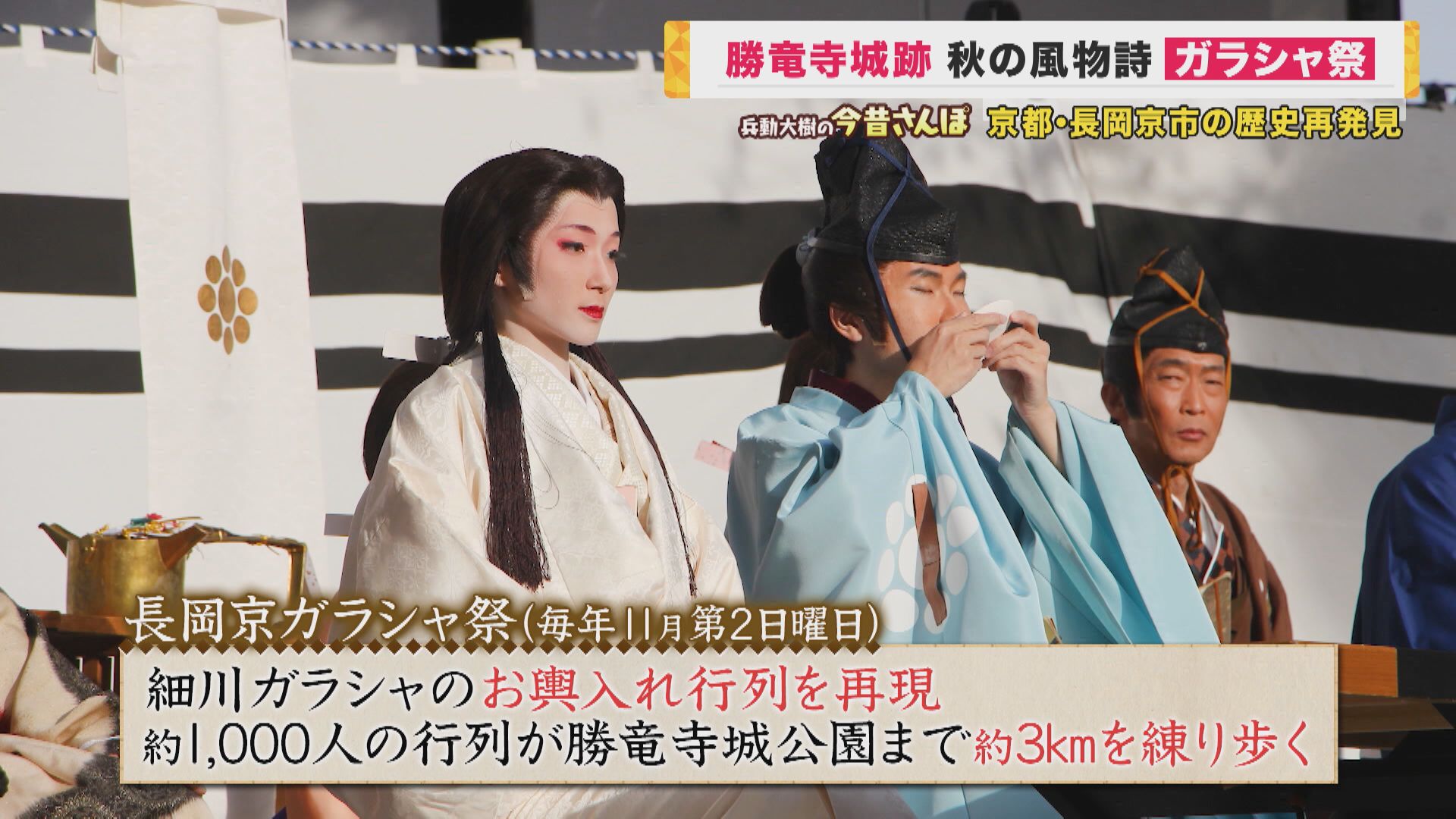 毎年11月の第2日曜日に行われる「長岡京ガラシャ祭」。細川ガラシャのお輿入れ行列を再現し、約1000人の行列が勝竜寺城公園まで約3kmを練り歩きます。
