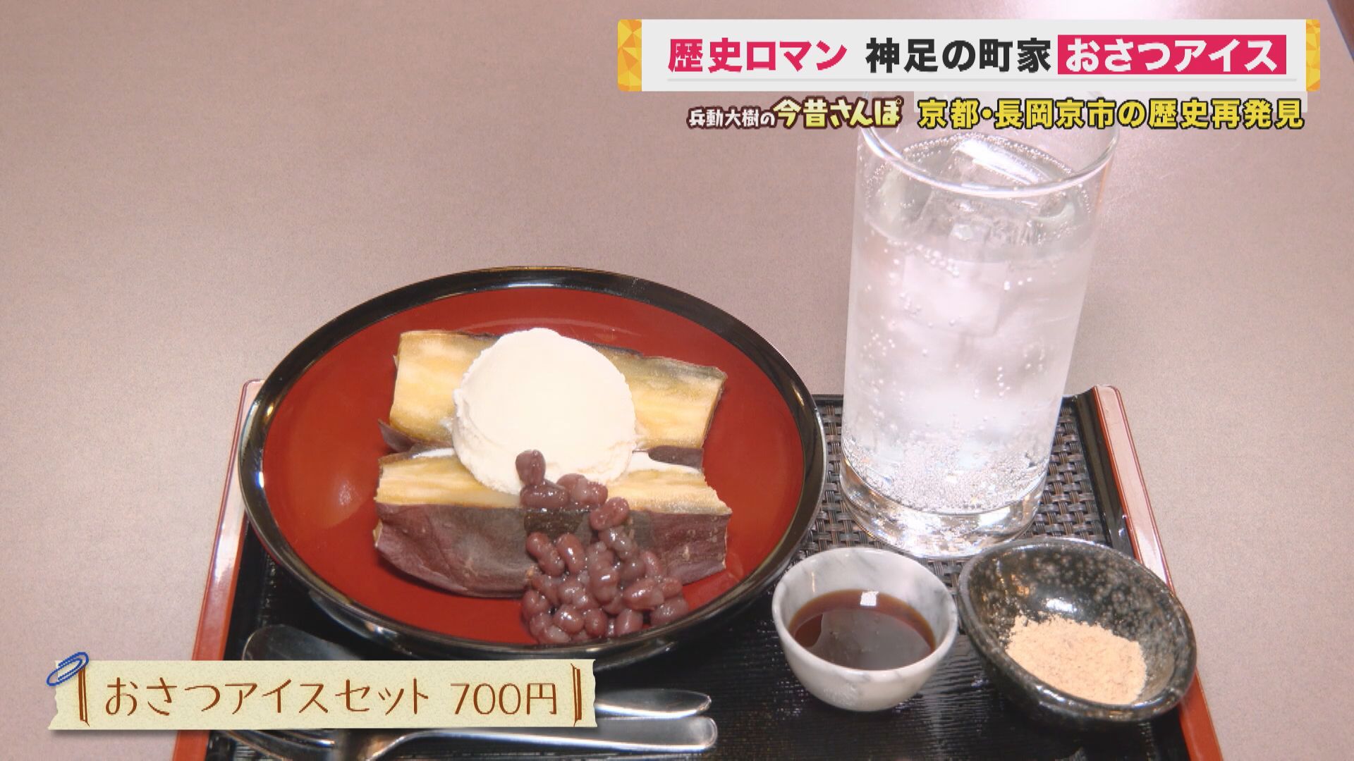 神足ふれあい町家は、江戸時代末期に建てられた旧石田家住宅を活用した、市民交流の場です。中にはカフェスペースもありました。せっかくなのでおすすめのメニュー、おさつアイスセットを注文。焼き芋にアイスクリームとあずきが乗っていて、さらに添えられた黒みつときなこをかけていただきます。