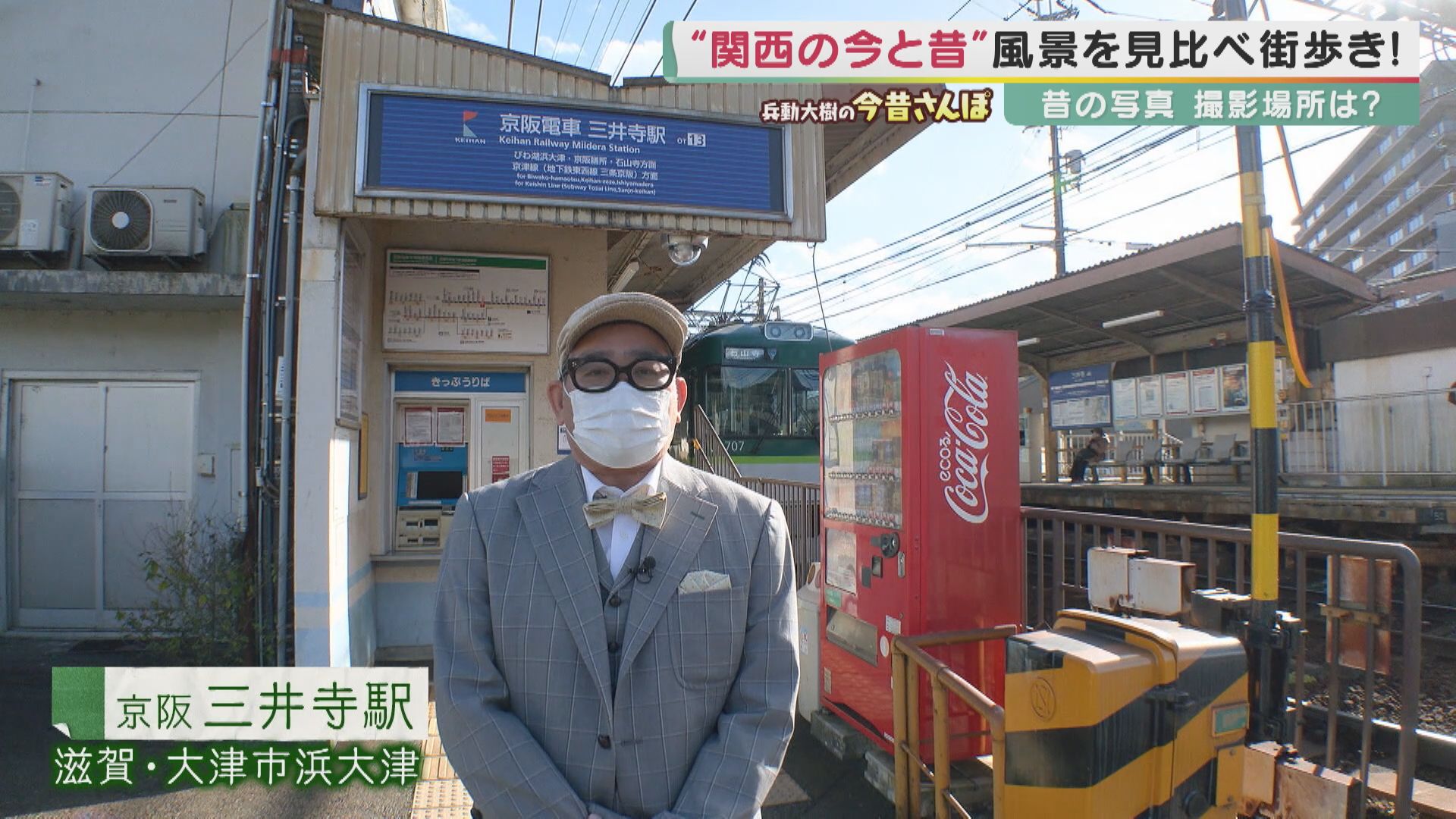 「京阪三井寺駅前からスタートです。向こう(北)の方に行くと坂本。石垣の有名なところですね。こちら(南東)行くと琵琶湖の大津駅の方に行くという路線ですね」