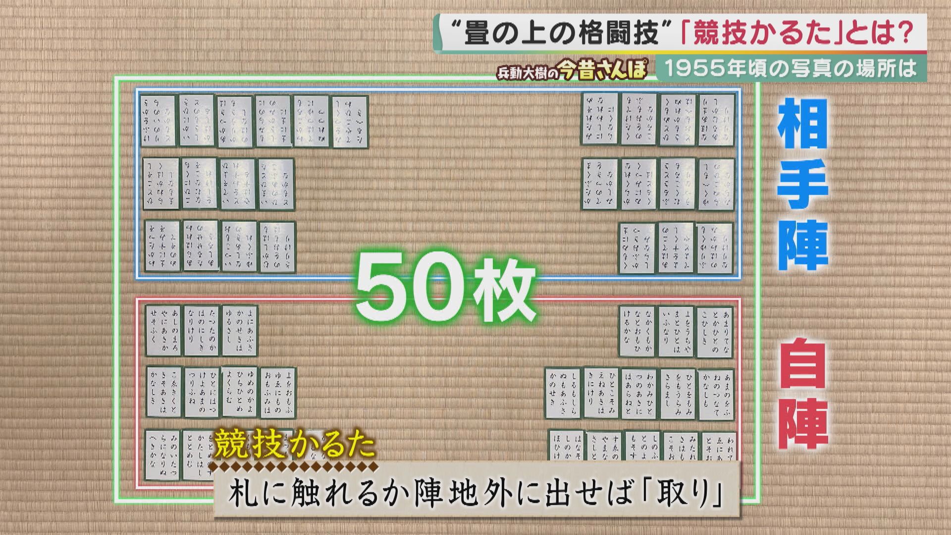 ルールが分かったところで、兵動さんも競技かるたに挑戦します。対するは、五段の五條さん。ハンデとして兵動さんの陣地には1枚だけ。さっきカルタくじで引いた「有馬山…」の一首です。いざ勝負!
