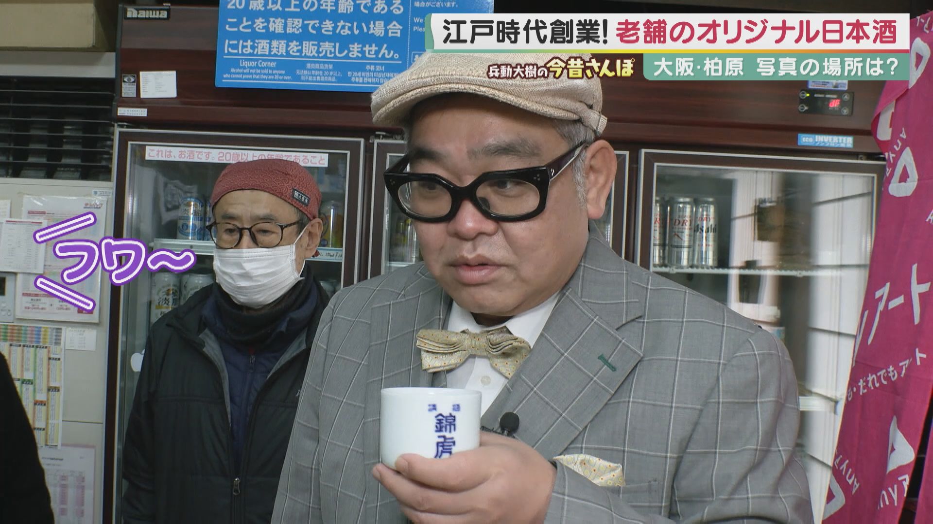 「創業は江戸末期ぐらいかな。もとは造り酒屋ですけどね。造り酒屋は昭和46年ぐらいにやめたんです。(棚に置いてあるお酒は?)『錦虎(にしきとら)』いいまして、うちで昔から作っている銘柄です。今は『千代酒造』で作ってもらってるんです。酒の味、見はります?」