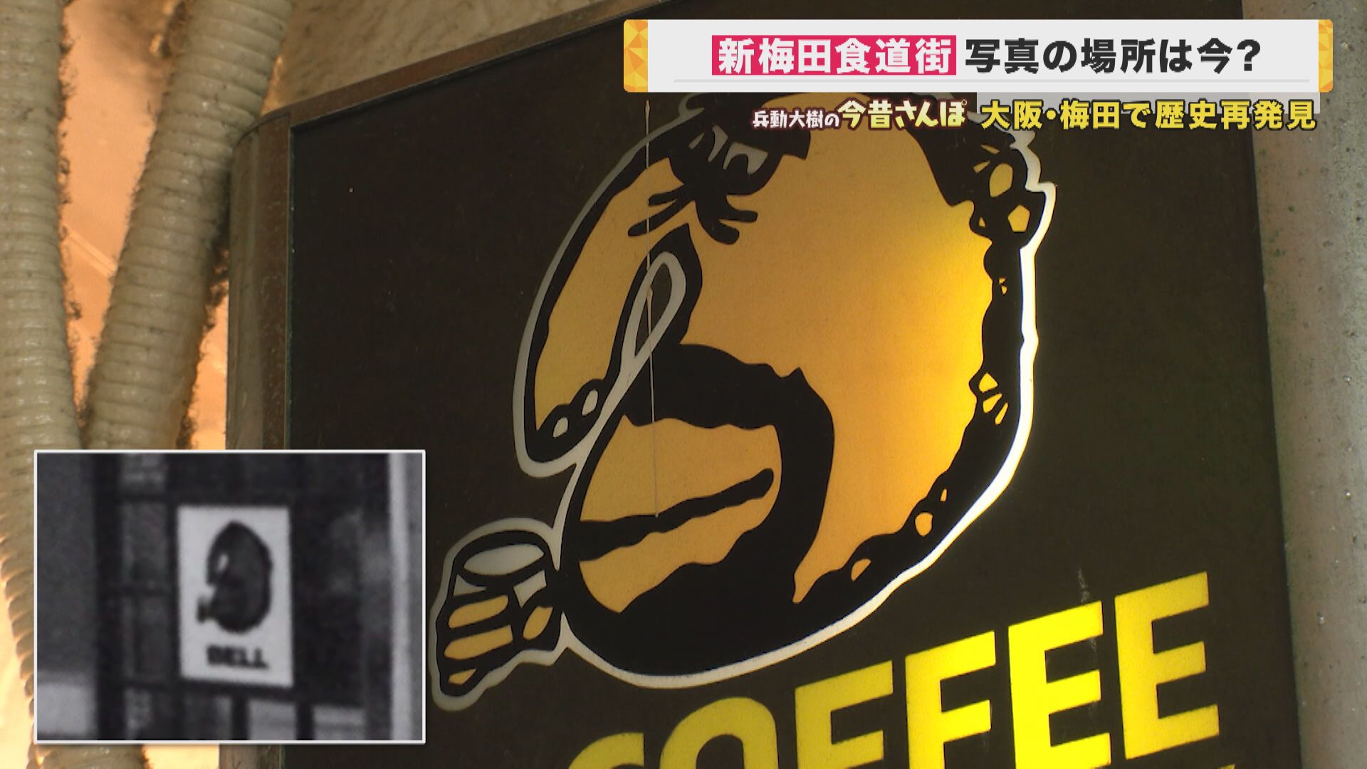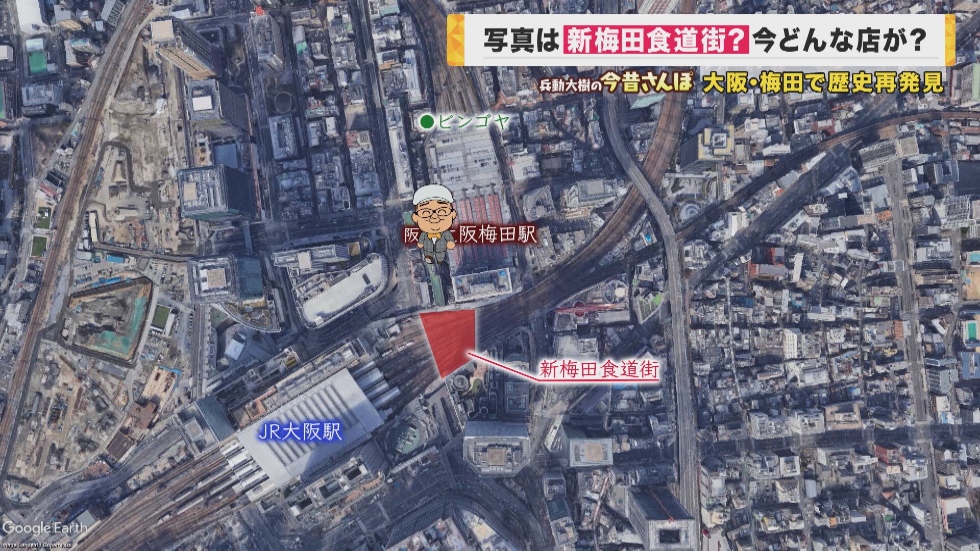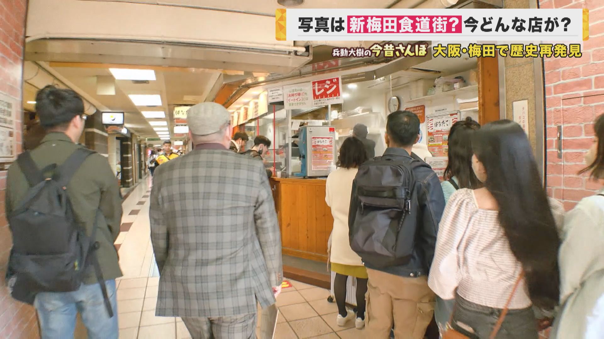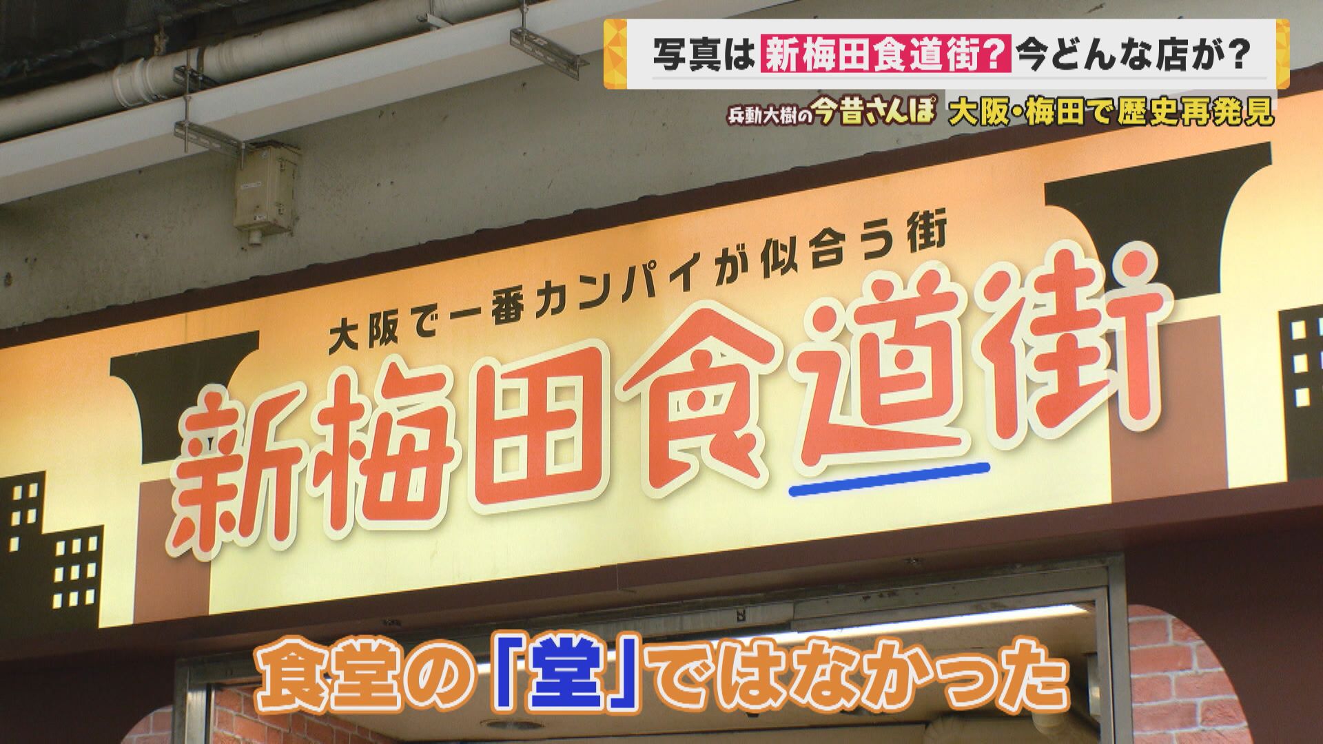 「さ、教えていただきました『新梅田食道街』にやってまいりました。(JR側から)阪急側に渡ってすぐここ。『大阪で一番カンパイが似合う街』というね(キャッチコピーが看板にあります)」