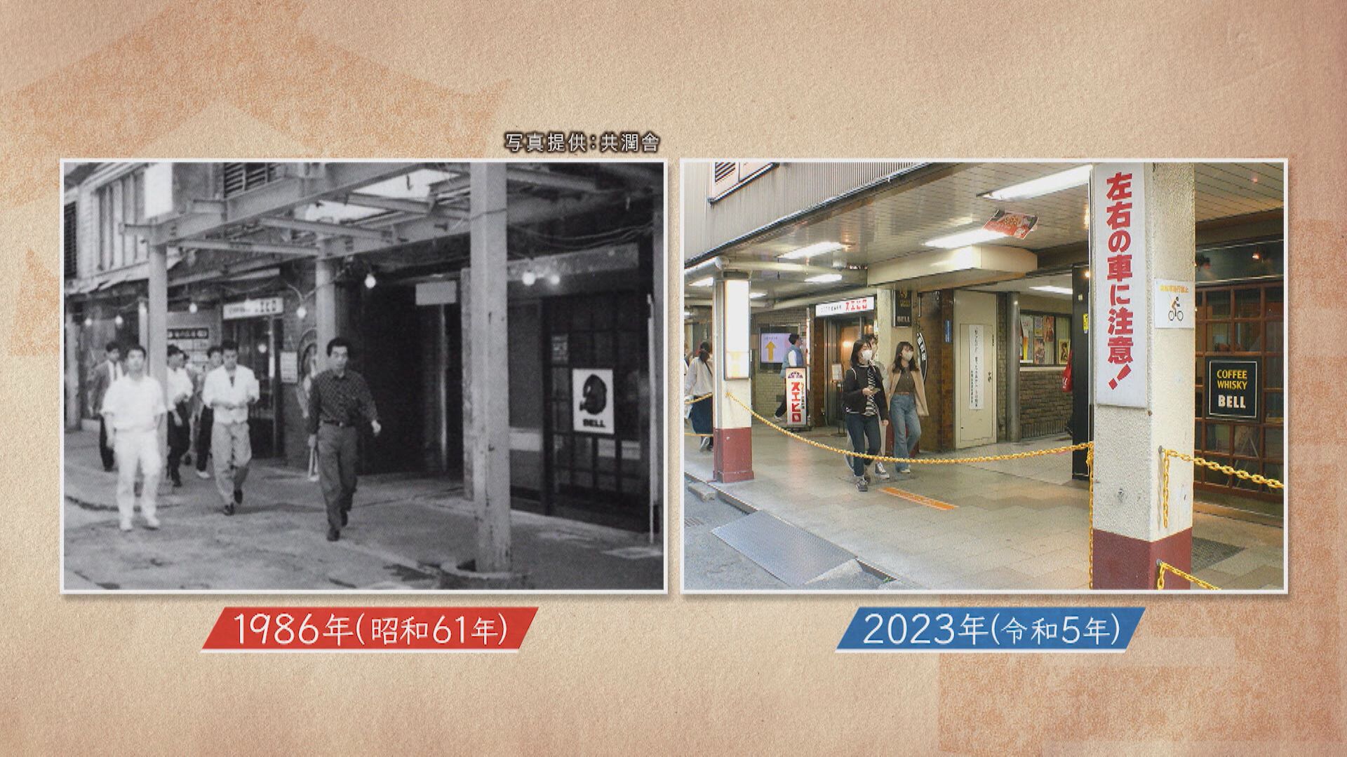 「はい、ここの通路をまっすぐ出られたところです。ベルさんてここに書いてありますしね。こちら(左側)はスエヒロさんかな?ベルさんも、スエヒロさんも(今も営業している)」
