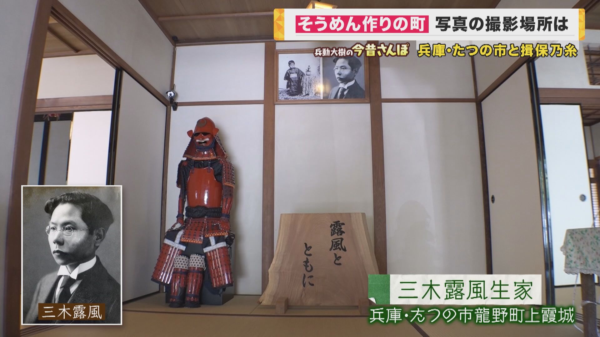 「(『三木露風生家』の看板を見て)『ミキロフウ』で合ってますか?ごっつすごいことした人ですよね。(ポスターを見て)これか、『赤とんぼ』。赤とんぼの歌ありますやん。『夕焼け小焼けの…』あの歌を作った方なんや」