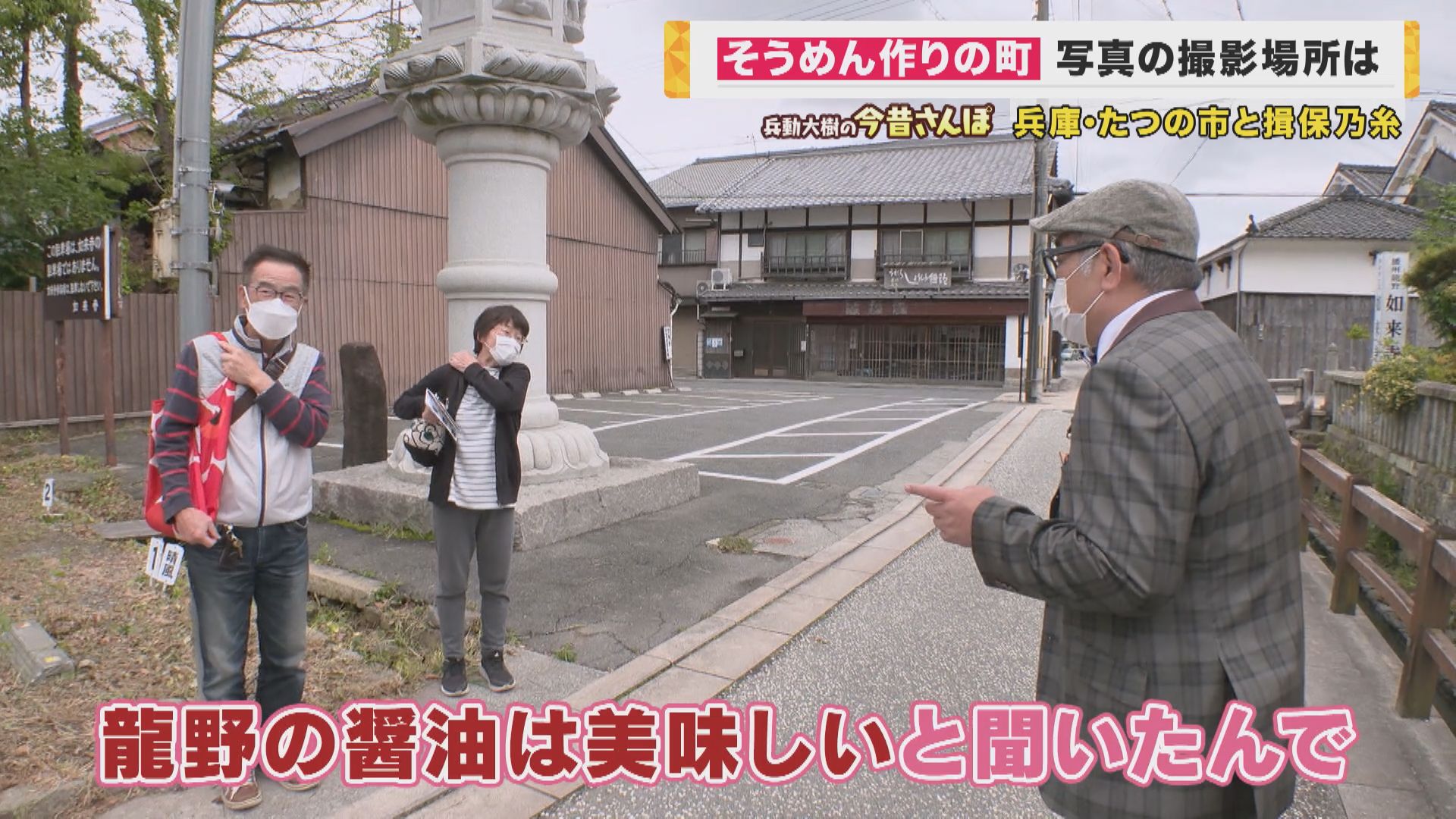 「ここも気になんねんな、煙突のとこ。『カネイしょうゆ株式会社』。今はやられてへんのかな?(歩いていた人に声を掛けて)番組で回らせてもろてる兵動いうんですけど、今日は?」