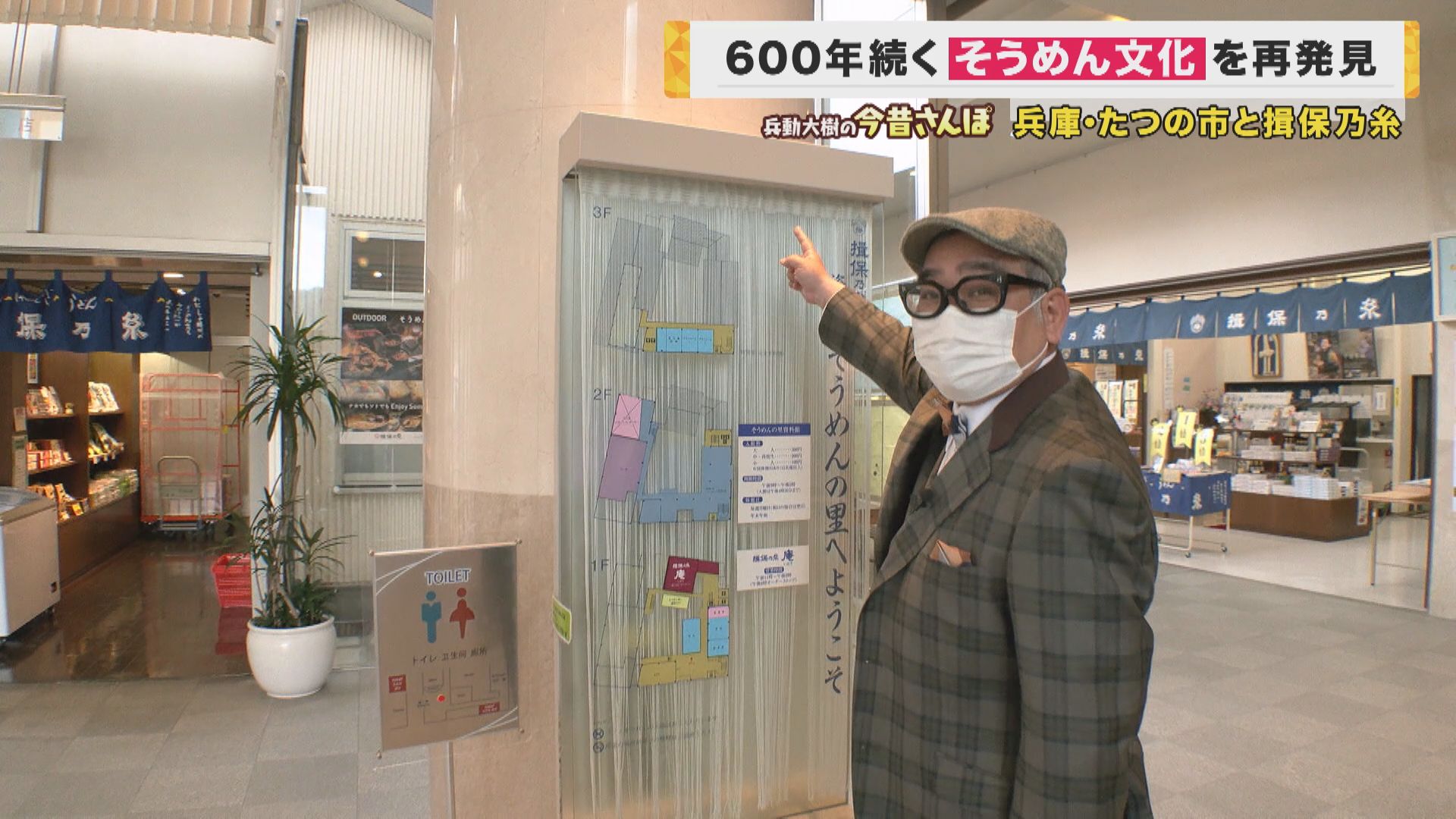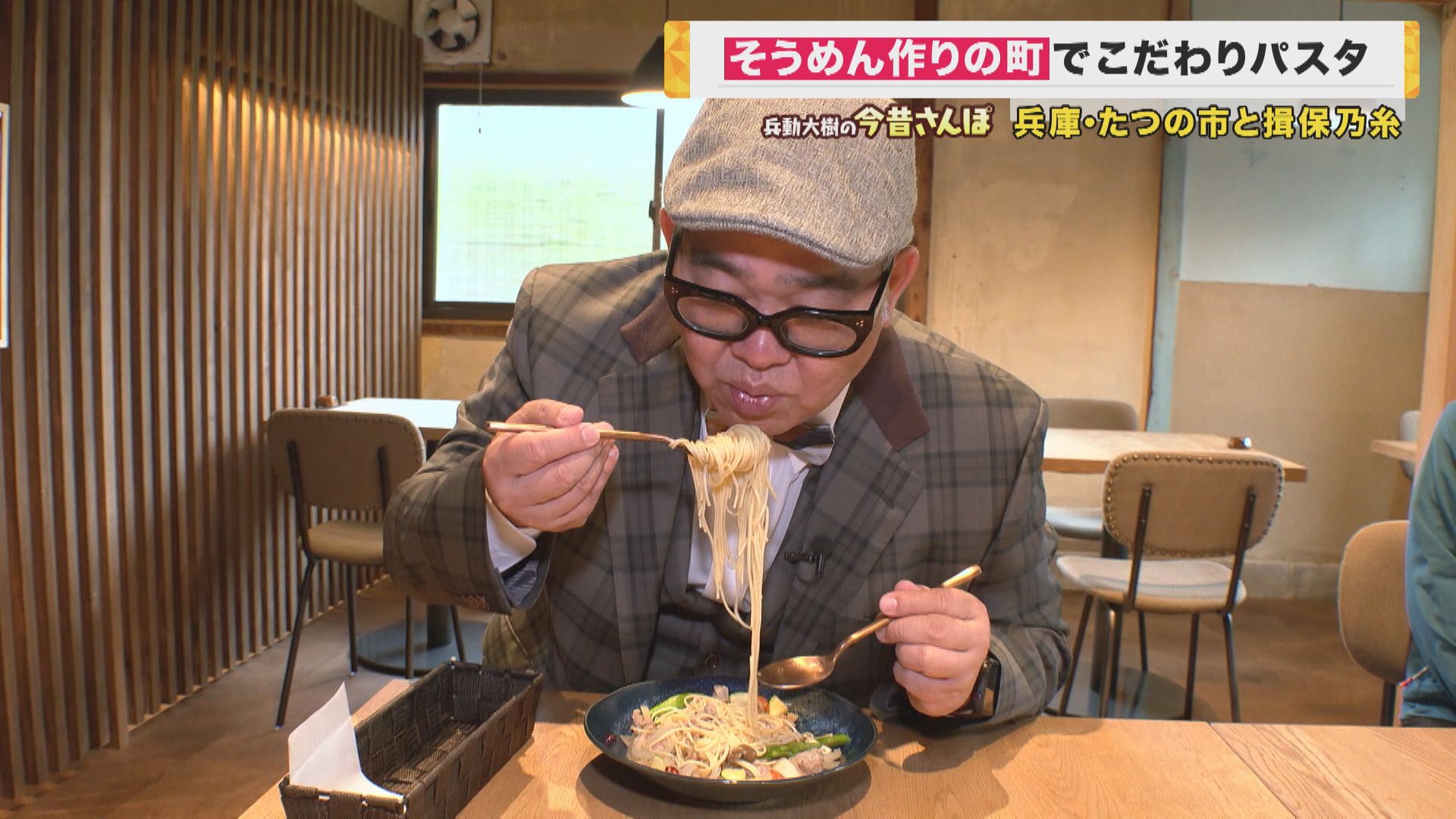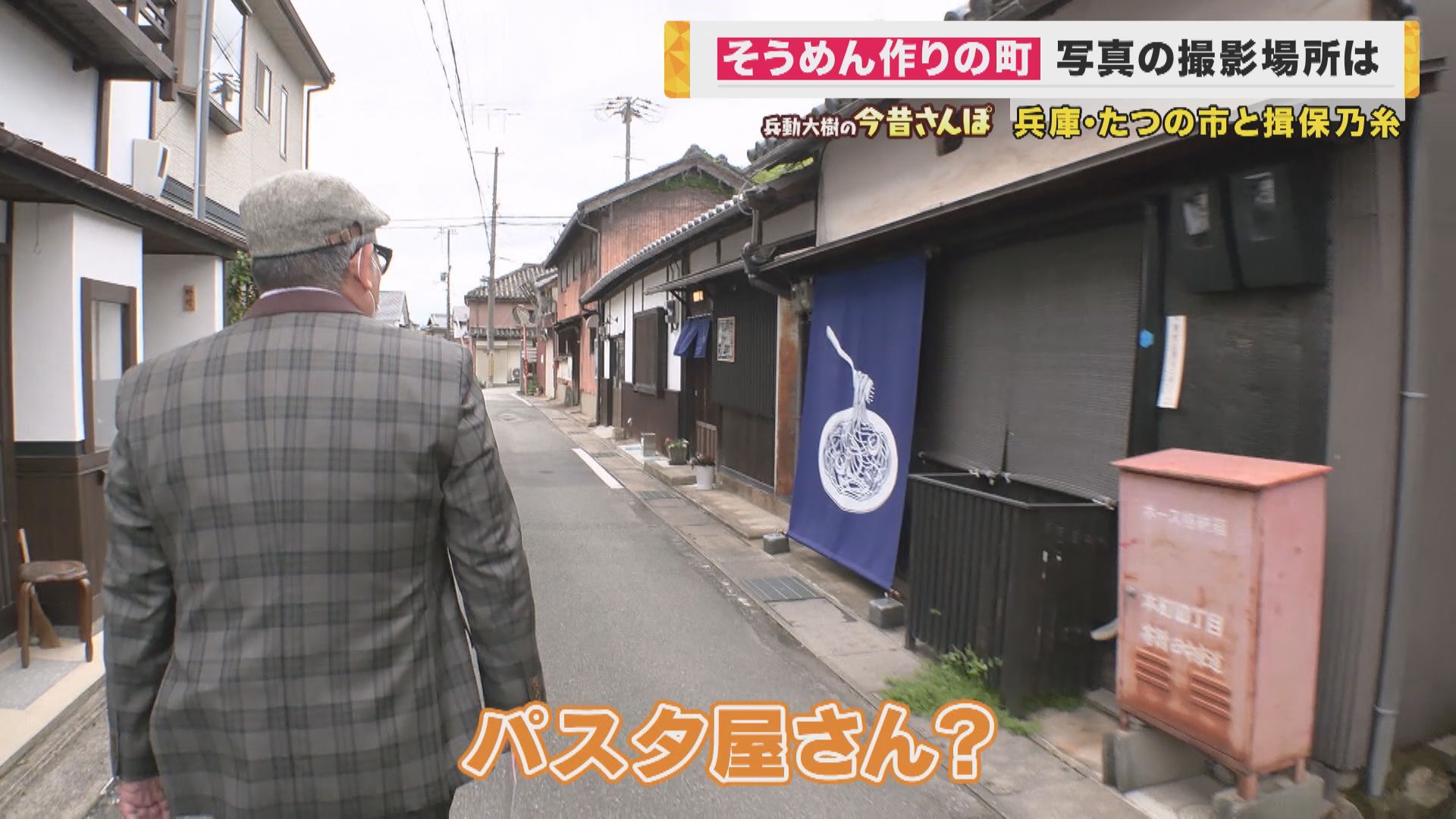 「パスタ屋さん?これまあまあ物議を醸しださへん?『ようそうめんのとこ(名産地)で、パスタきたな』みたいな。ちょっと聞いてみよか。(扉を開けて)うわーここも風情あるわ。すいません。『newsランナー』って番組で回らせてもろてる兵動いうんですけど。さっき言うてた『バチ(そうめんの切れ端)』が売られてる。そうめんも売ってはんねや。『龍の夢PASTA』。これはパスタって書いてあるけど、どういうこと?揖保乃糸が置いてるの?」