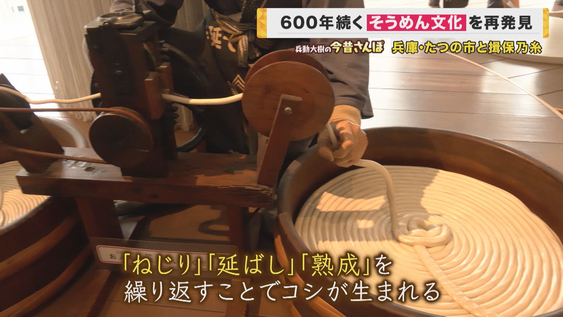 「これ見ていただいたら分かる通り、ちょっとねじりながら、よりをかけて、麺をしっかり強くするためにやっています。熟成をかけながら、徐々に細く長く延ばしていくんですね。こういった道具を使って、さらに細い所を通して、さらに細くしていく。これを順次繰り返していくんですね。熟成かけてグルテンを形成させて、それを筋状、縦に伸ばしていく。そうすることによって、グルテンというのが形成されてより強い麺になっていくんですね」