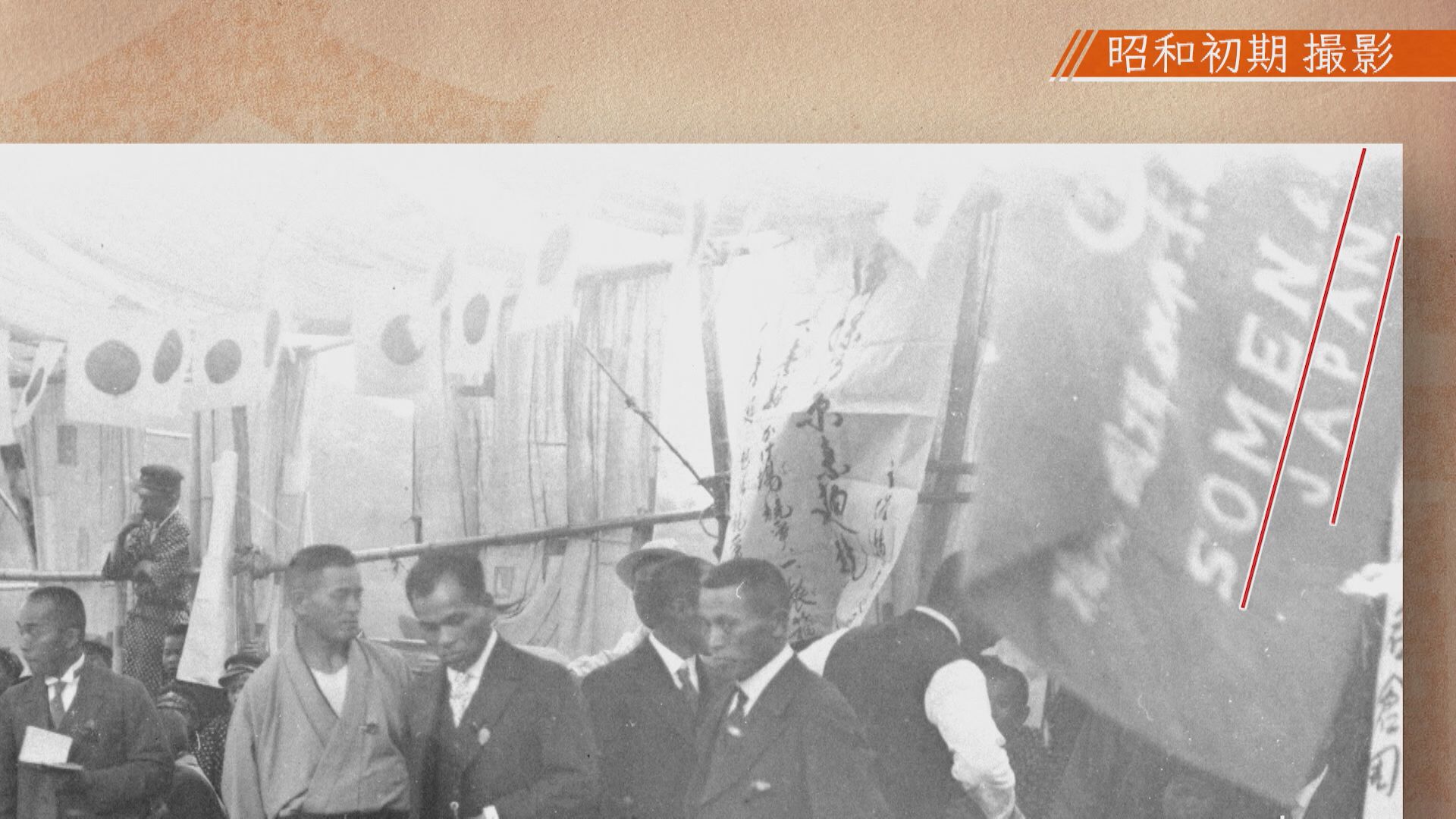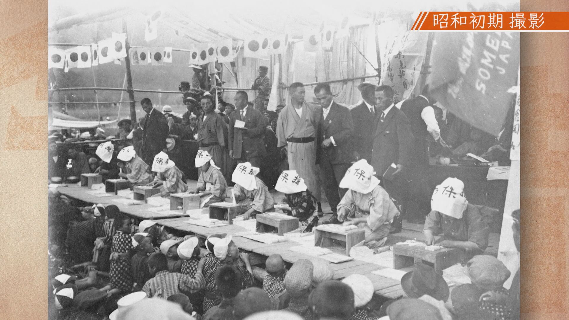 「なんか書いてある字。これ“揖保乃糸(いぼのいと)”。ここ(右側)にもローマ字で“SOMEN JAPAN”て書いてある。えー、昭和初期、何してるとこなんやろ。子どもらがすんごい見てるね。なんかの競技かな?ちょっと聞き込んでみます」