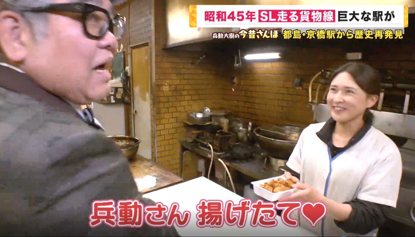 【兵動さん】「うわ、すごいな。揚げてくれはったん。むちゃくちゃおいしい。ころもがおいしい上に、鶏肉がジューシーで、これ250円!? 熱っ、うまっ」