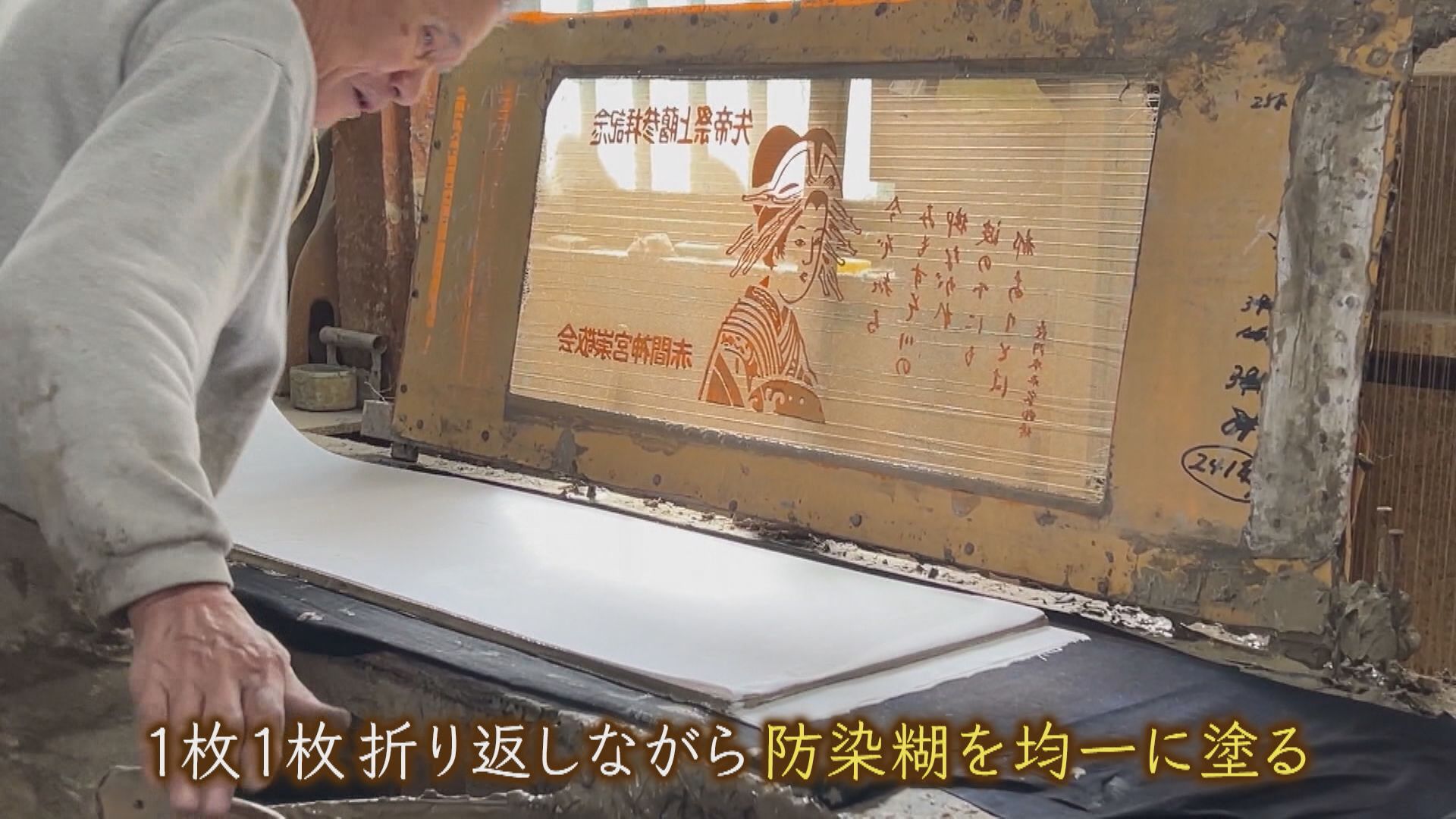 まず白い生地に型紙をかぶせ、その上から防染のりを均一に塗る作業をします。生地を1枚1枚折り返し、この作業を50回ほど繰り返します。のりを付けた部分には染料が染み込まないので、白く残ります。さらに防染のりで囲いを作り染料を注ぎ込み、生地に浸透させることで何十枚も同時に染めることができます。
