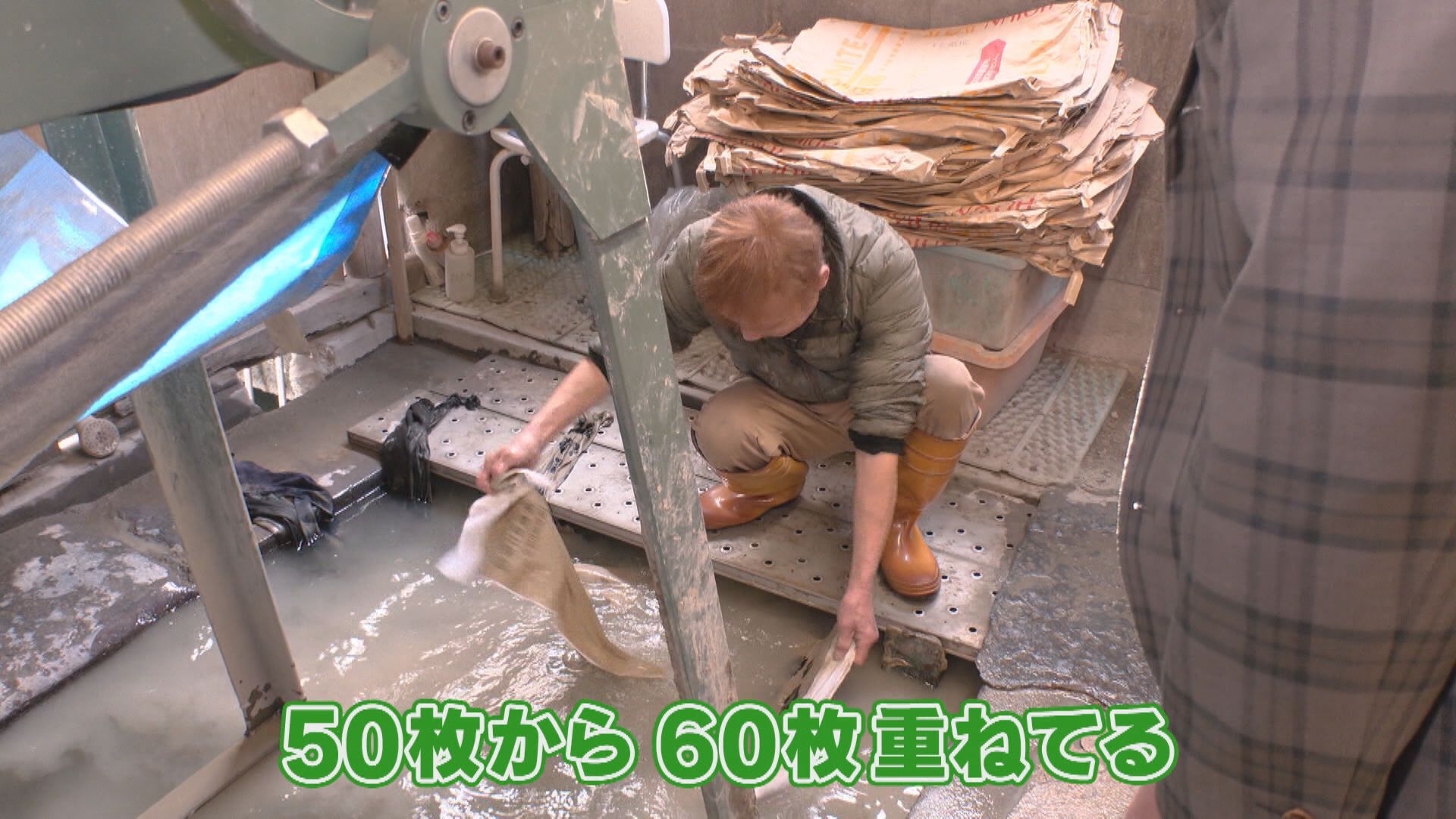 【兵動さん】「(干し場の天井を見上げて)高っ。あの上から干してんのか。(神奴さんが)上にあがってる。マジ。えらい高い場所の丸太の上を歩いている。大丈夫?」