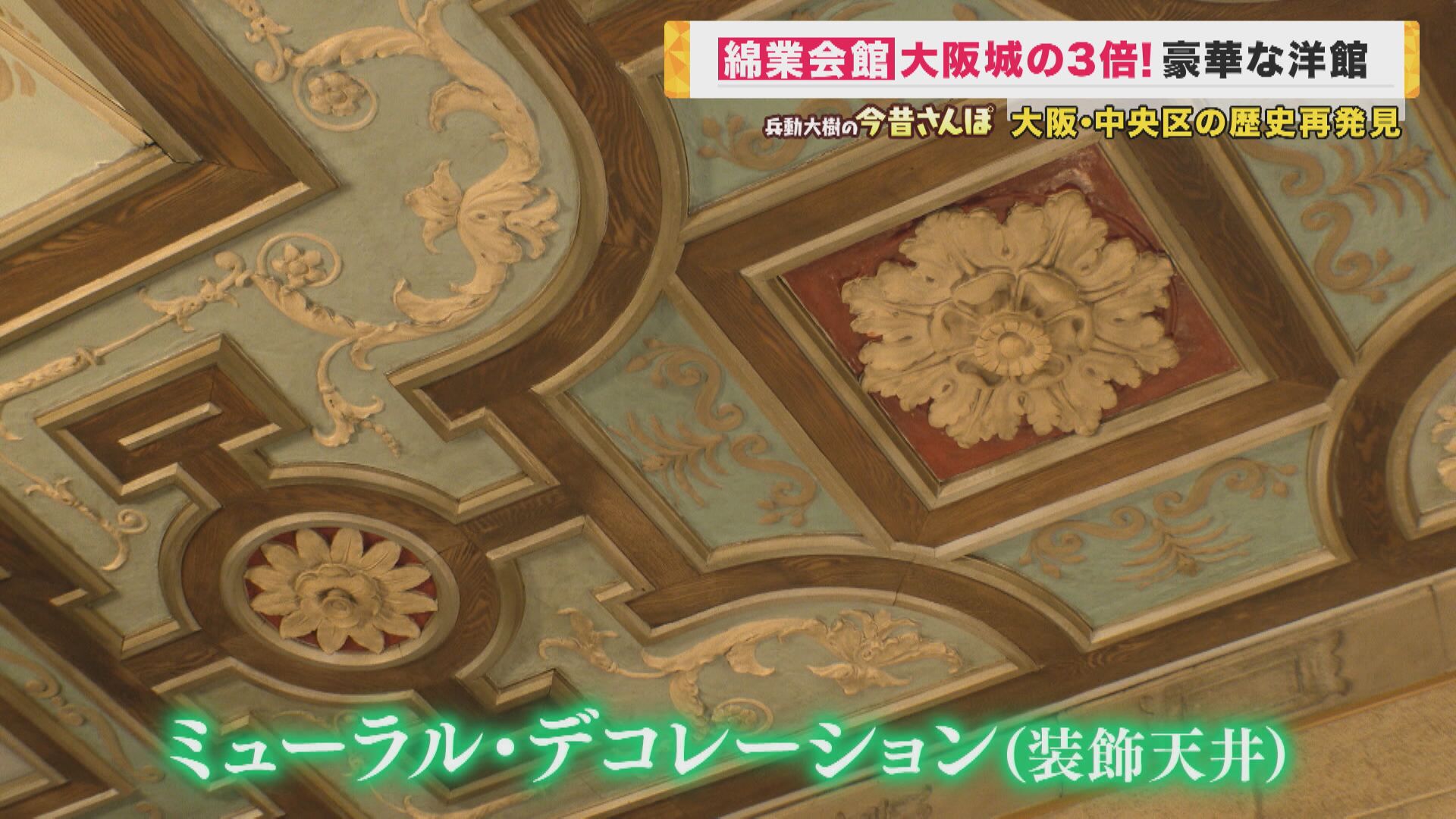 【日本綿業倶楽部 専務理事 槙島昭彦さん】「こちらは1900年初頭のアメリカのホテルとかお屋敷のホールをイメージして造られた、会員食堂と呼ばれるお部屋です。特徴は天井の装飾なんかを見ていただきますと、漆喰と寄木細工でできた“ミューラル・デコレーション”と呼ばれる細工がされていて、非常に豪華に造られています」