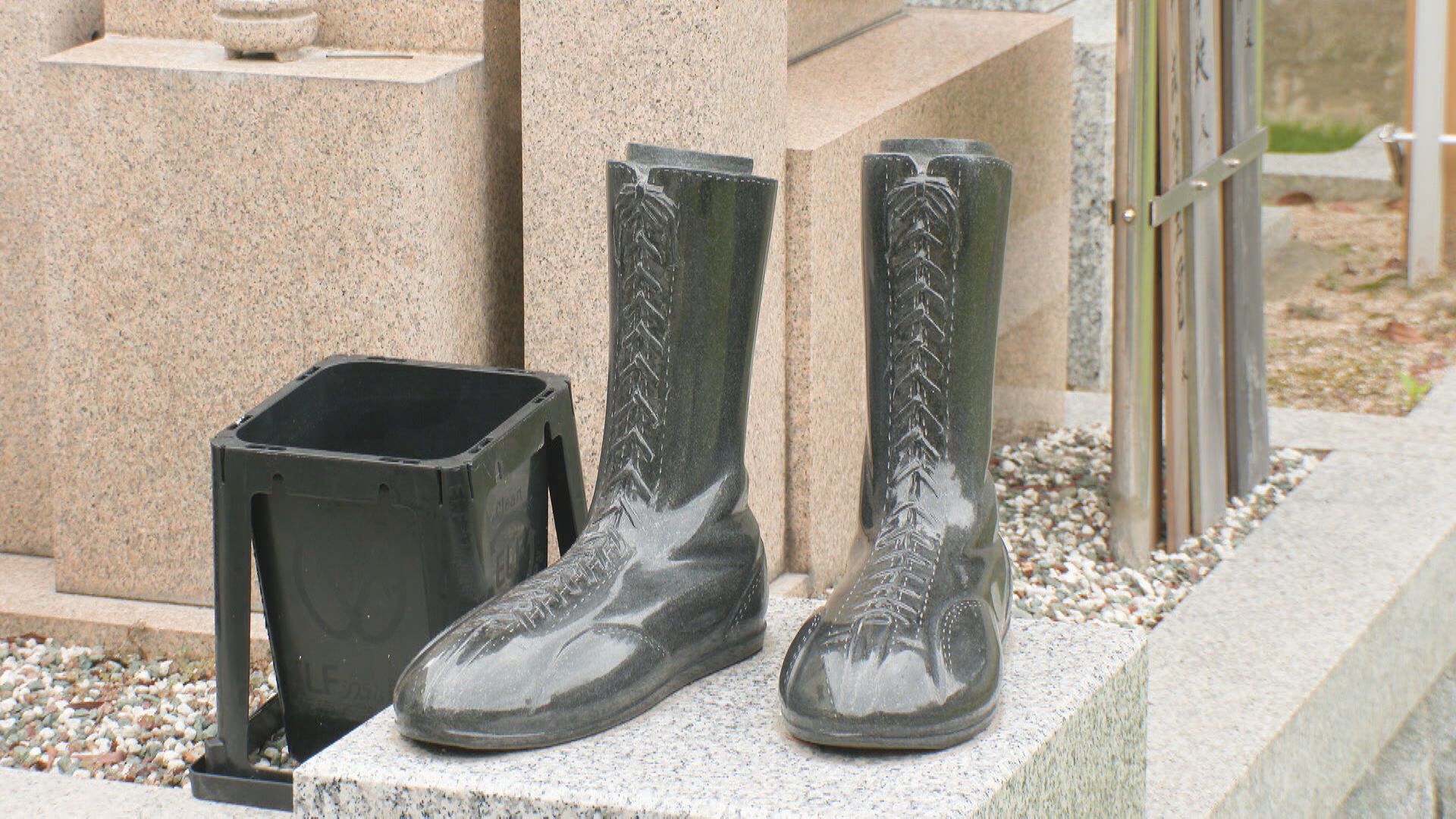 お墓の前には、必殺技「16文キック」をイメージさせるリングシューズの石像がありました。
