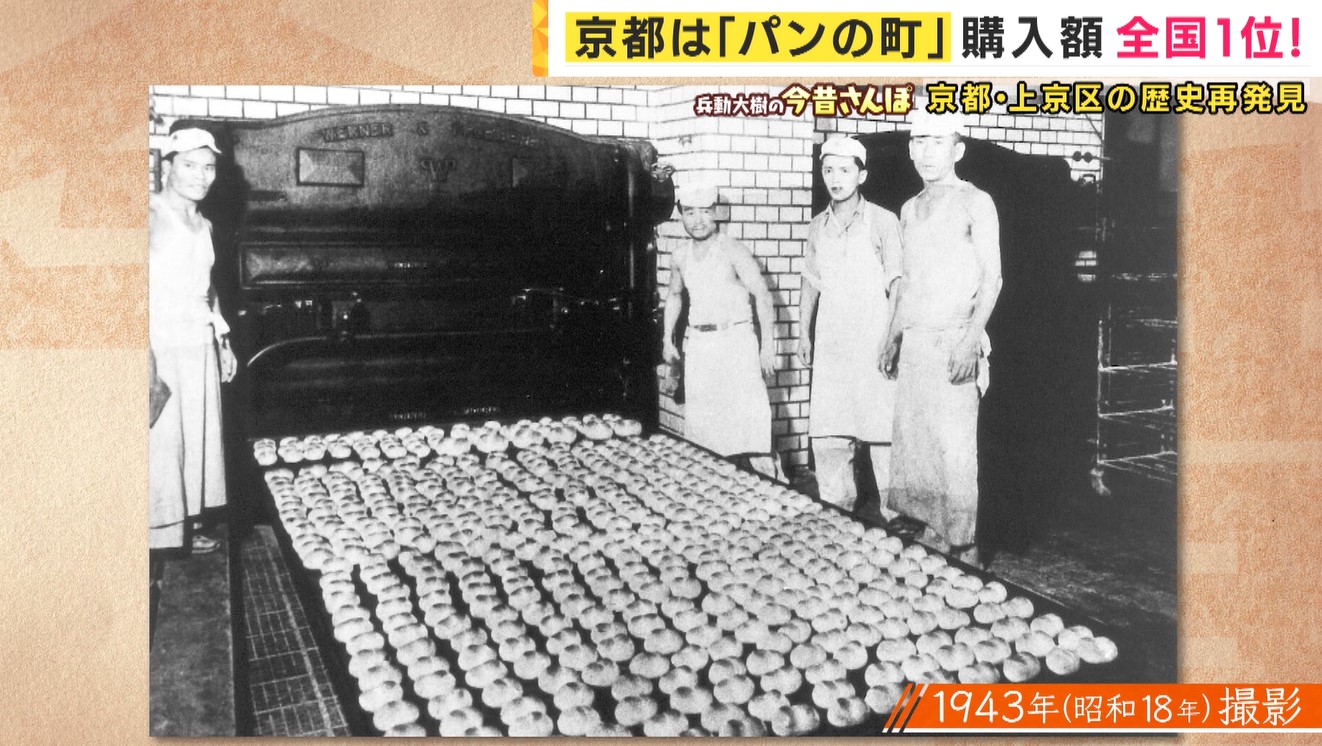さて1943年(昭和18年)に京都市で撮影された写真。4人の職人さんと窯のような大きな機械、その手前にはずらっとパンが並んでいます。どこで撮られた写真なのか、兵動さんが探ります。