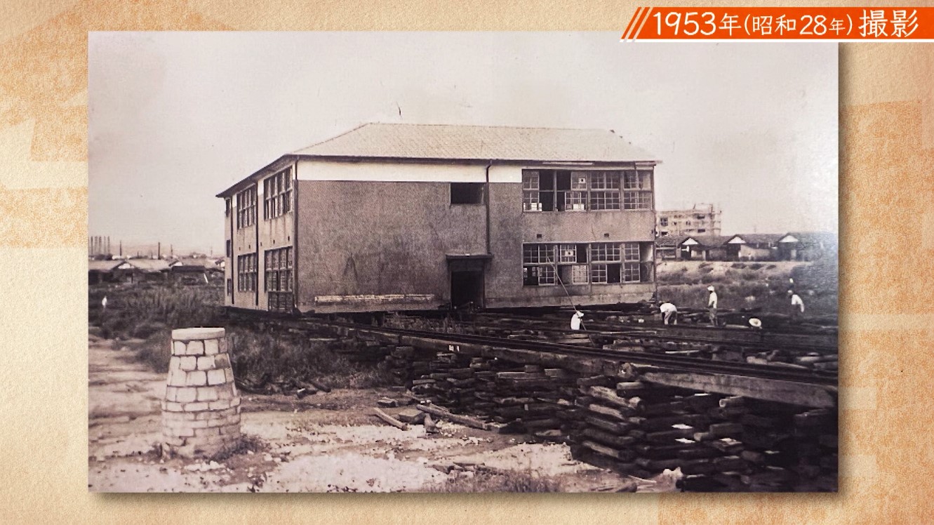写真の八幡屋小学校は区画整理のため、高さを上げてレールを敷き、曳家という方法で校舎を丸ごと移動させたのです。