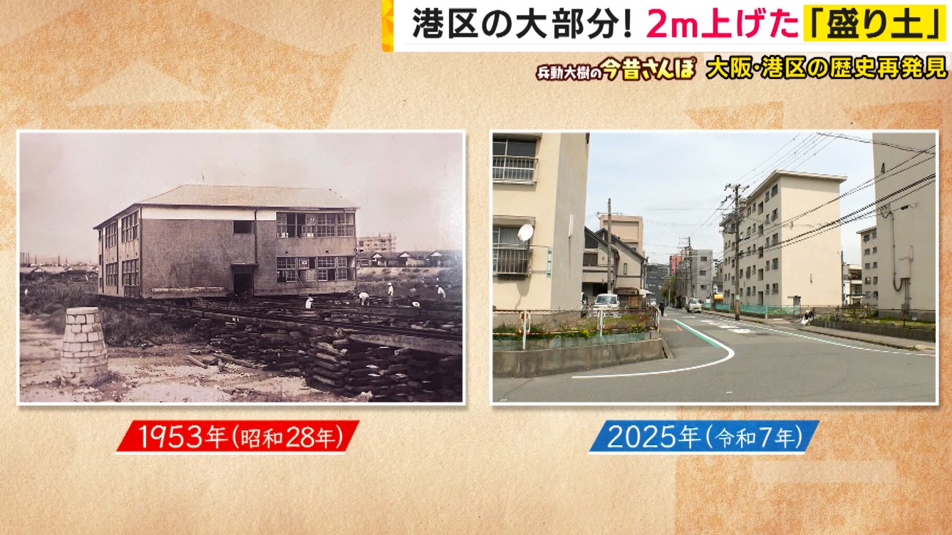 大阪港の一部でもある港区は海と陸をつなぐ重要地点だったため、太平洋戦争の空襲を受け焼け野原となりました。また戦前は工場地帯であったため地下水の汲み上げが激しく、一帯が1メートル以上地盤沈下していたことで、昭和25年のジェーン台風で浸水などの甚大な被害を受けました。