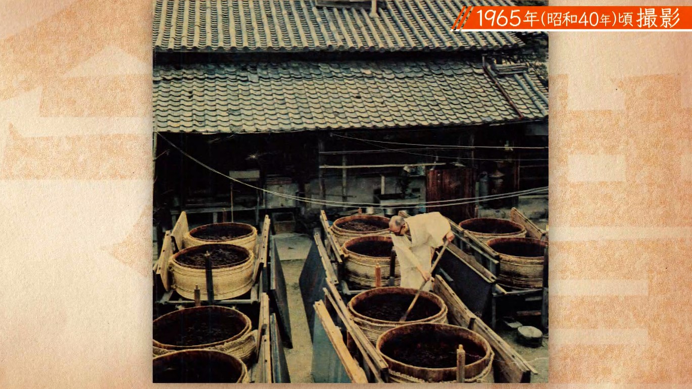 1965年(昭和40年)頃に京田辺市内で撮影された、大きなたるが並んだ風景。男性がかき混ぜているようです。「しょうゆかみそか?京田辺の名産なのか」と見当をつけて、兵動さんは探索へ出発しました。