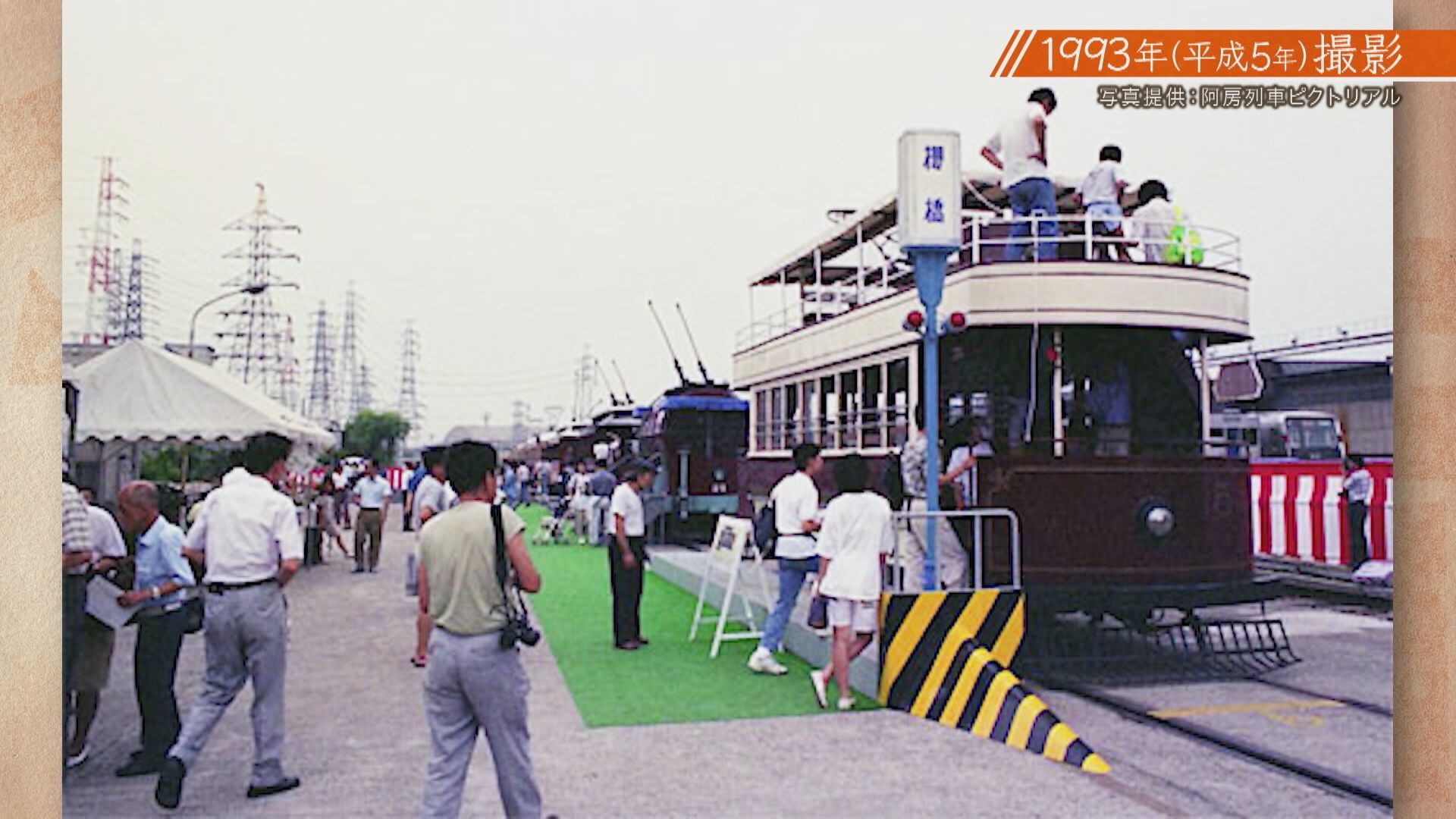そんな北加賀屋で探索するのは、1993年(平成5年)に撮影された路面電車の写真。何台も並んでいて、珍しい2階建ての車両も見えます。