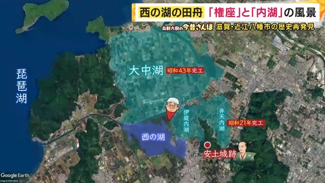 【船頭さん】「ここは、弁天内湖って1つの西の湖の一緒の大きさの広さだった。山の向こうが伊庭内湖。ここも湖やった」