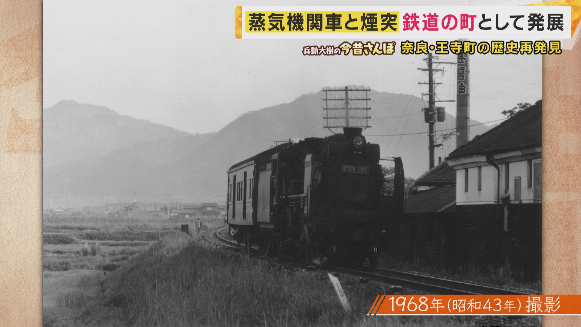兵動さんが受け取ったのは1968年(昭和43年)に奈良県王寺町で撮影された1枚の写真。そこには力強く走る蒸気機関車と、背後にそびえる山、そして「山甚醤油」と書かれた看板が写っています。