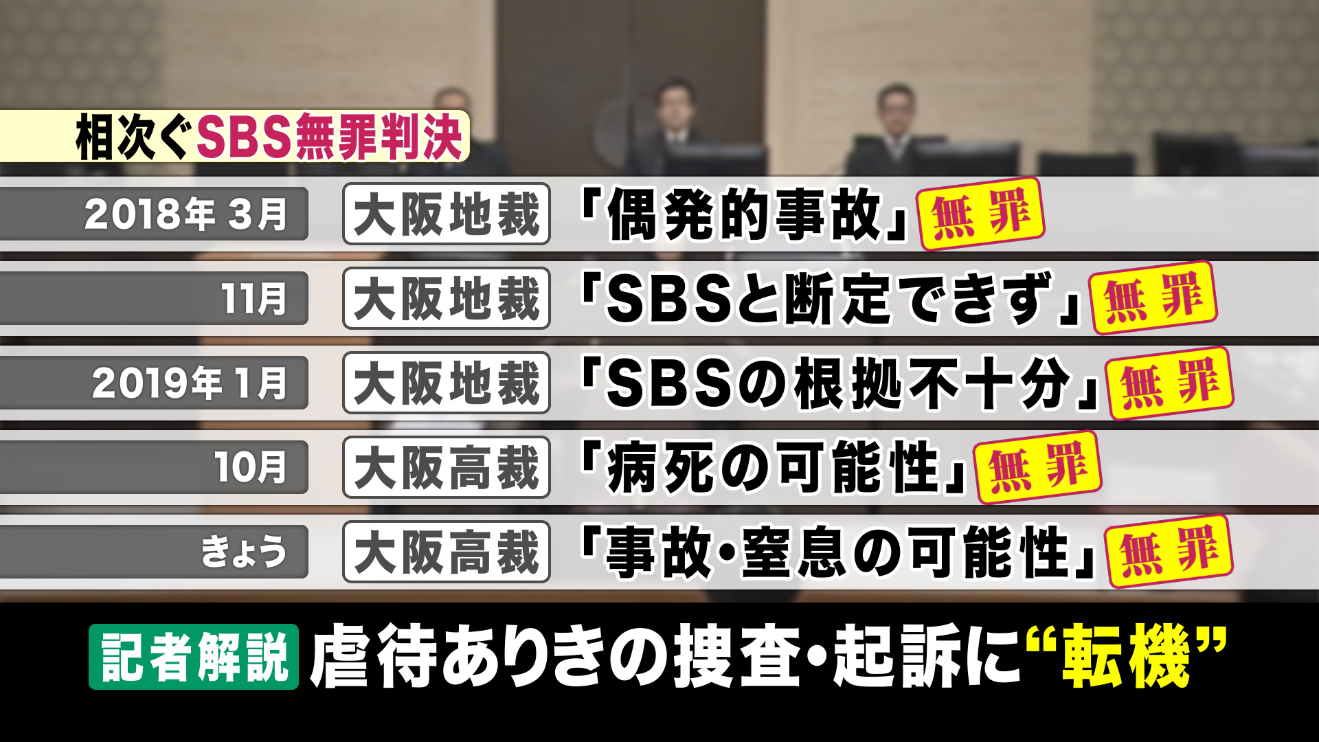 去年10月には、生後2か月の孫を揺さぶって虐待として、一審で実刑判決を受けた祖母に逆転無罪判決が言い渡されています。