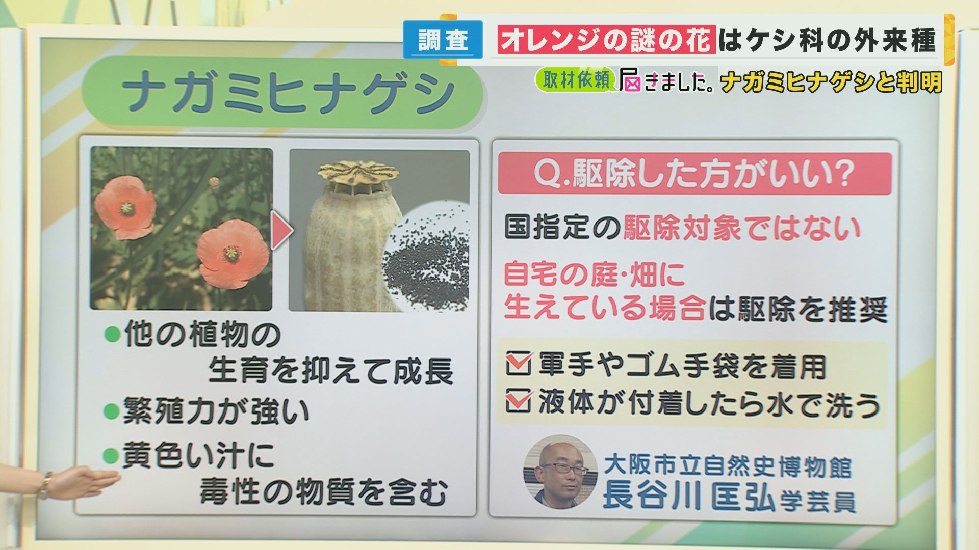 関西でも色々なところで見かけるオレンジの謎の花の正体は、「ナガミヒナゲシという、繁殖力が強く、触ると害のある花」というのが、今回の取材の結論でした。