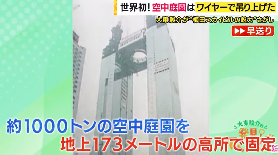 梅田スカイビルは世界初の建築技術が採用されました。地上で組み立てた「空中庭園」をワイヤーで吊り上げる「ワイヤーリフトアップ工法」で建てられたのです。まず、2つのビルを外側に反らせて建て、空中庭園をリフトアップすることでビルが平行に修正される仕組み。1分間で35センチ、7時間かけて吊り上げました。およそ1000トンの空中庭園を地上173メートルの高所で固定する作業は画期的な試みでした。