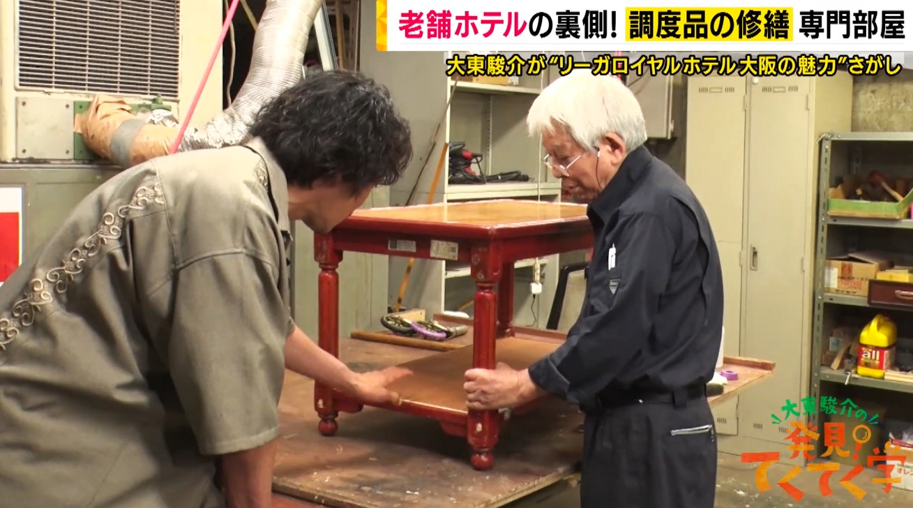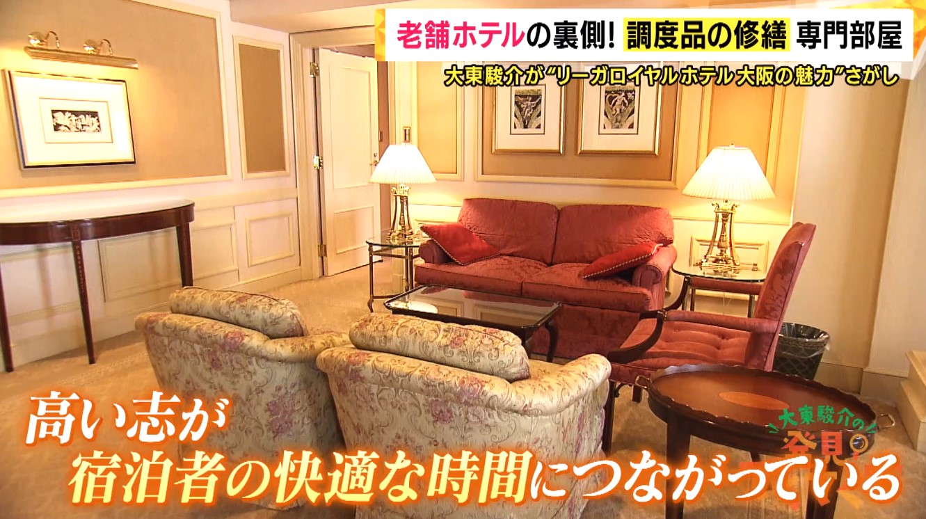 リーガロイヤルホテル大阪のバックヤードには、老舗ホテルの風格を守る専門スタッフがいます。客室の家具など、ホテルの調度品の修繕を行う専門の部屋で、およそ30人の職人が、1000以上ある全ての客室の点検と修繕を担っています。