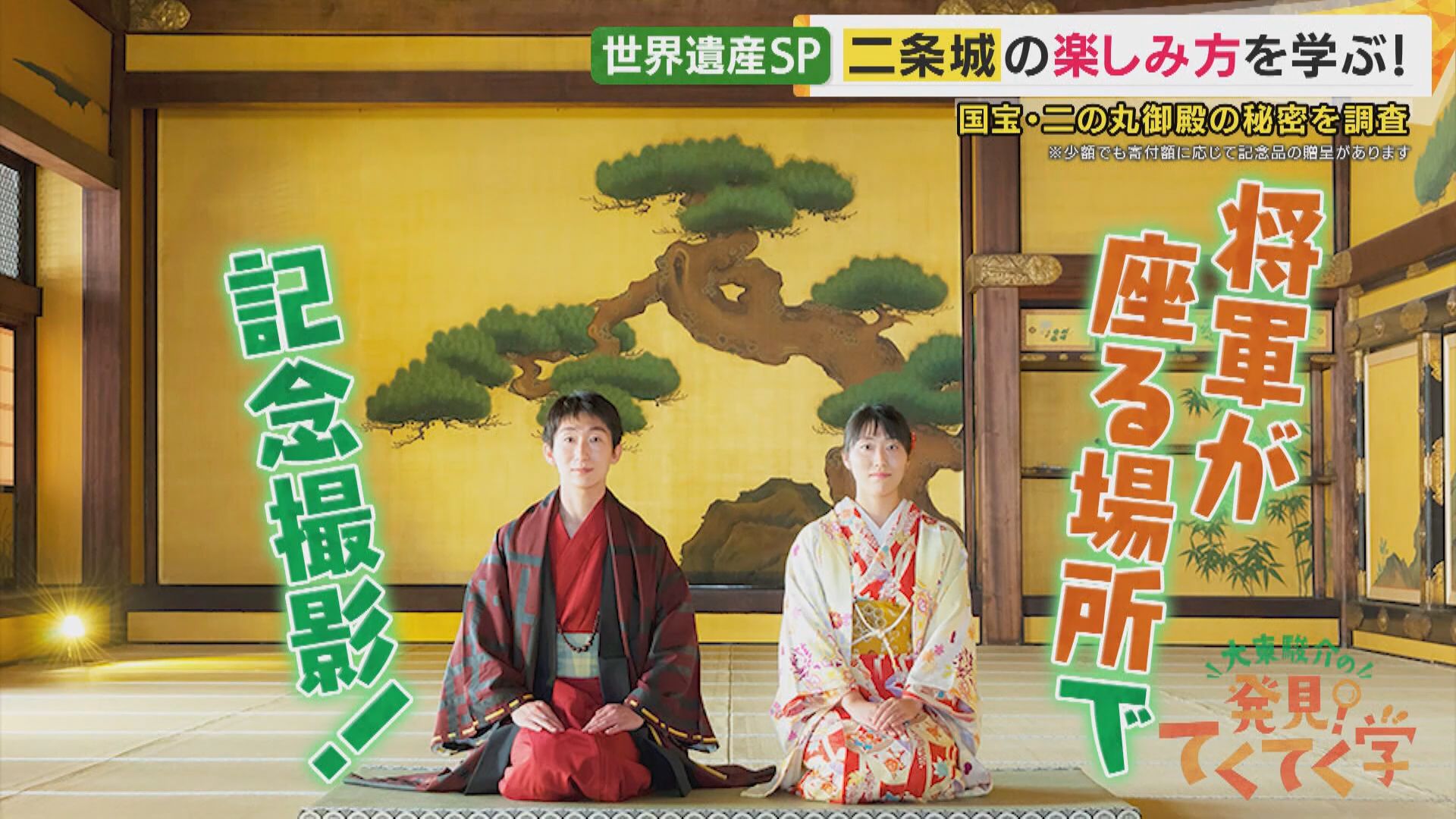 二条城の修繕事業の支援のための「一口城主募金」に1万円以上寄付した人の中から抽選で、大広間の将軍が座る場所で記念撮影ができるという特典があります。