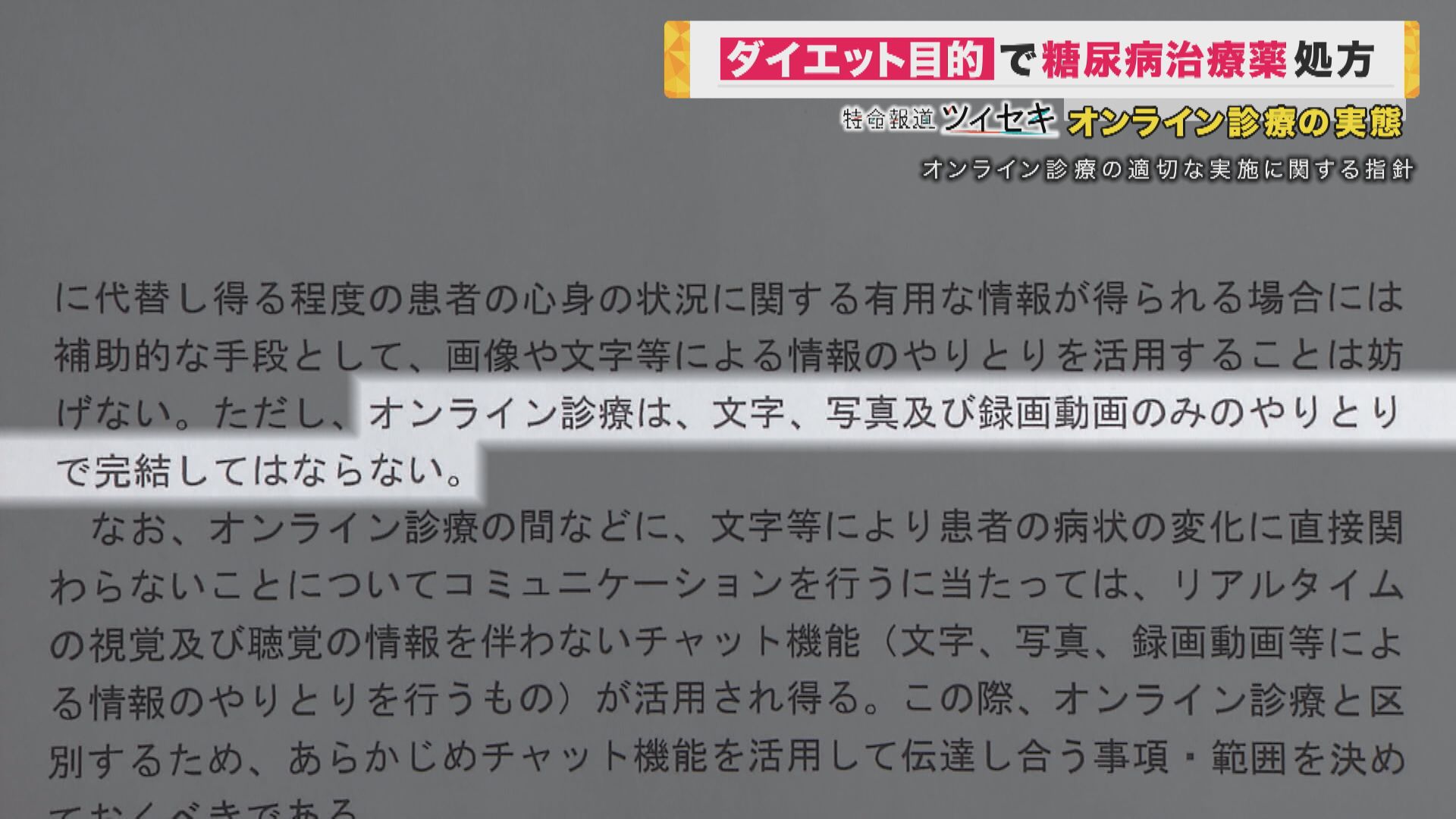 しかし、厚生労働省が出すガイドラインには「オンライン診療は文字、写真および録画動画のみのやりとりで完結してはならない」と記載されています。大阪市保健所に確認すると、ガイドラインの違反によって行政指導の対象になる可能性があるということです。
