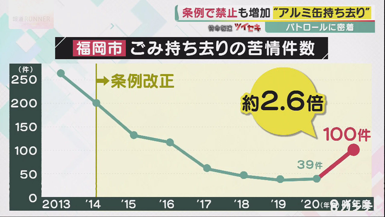 2014年からアルミ缶などの家庭ごみの持ち去りを禁止し、市民から寄せられる苦情の件数は減り続けていましたが、その件数が、昨年度は前の年の2.6倍に急上昇。