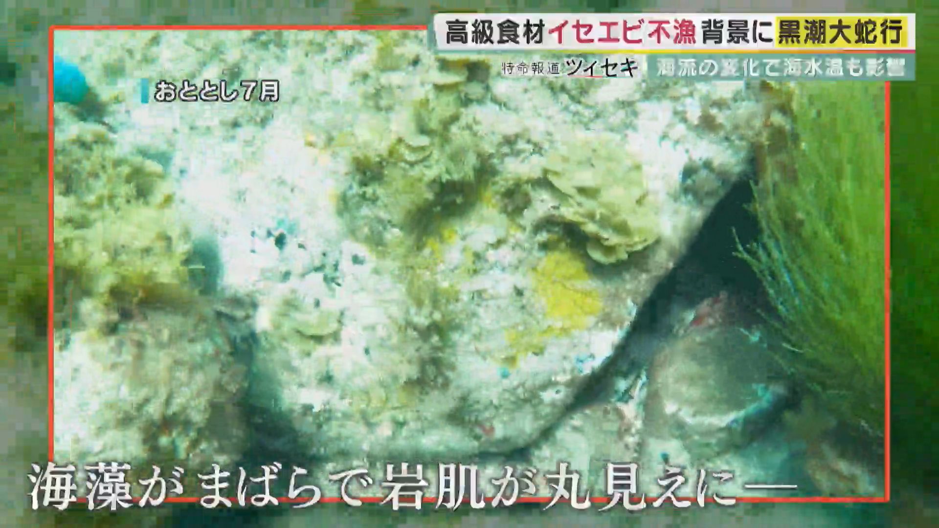 海の中を潜ると…海藻がまばらで岩肌が丸見えになっていて、水温が上がったことで伊勢エビや貝のエサとなる海藻が枯れ、海底では“磯焼け”が進んでいました。