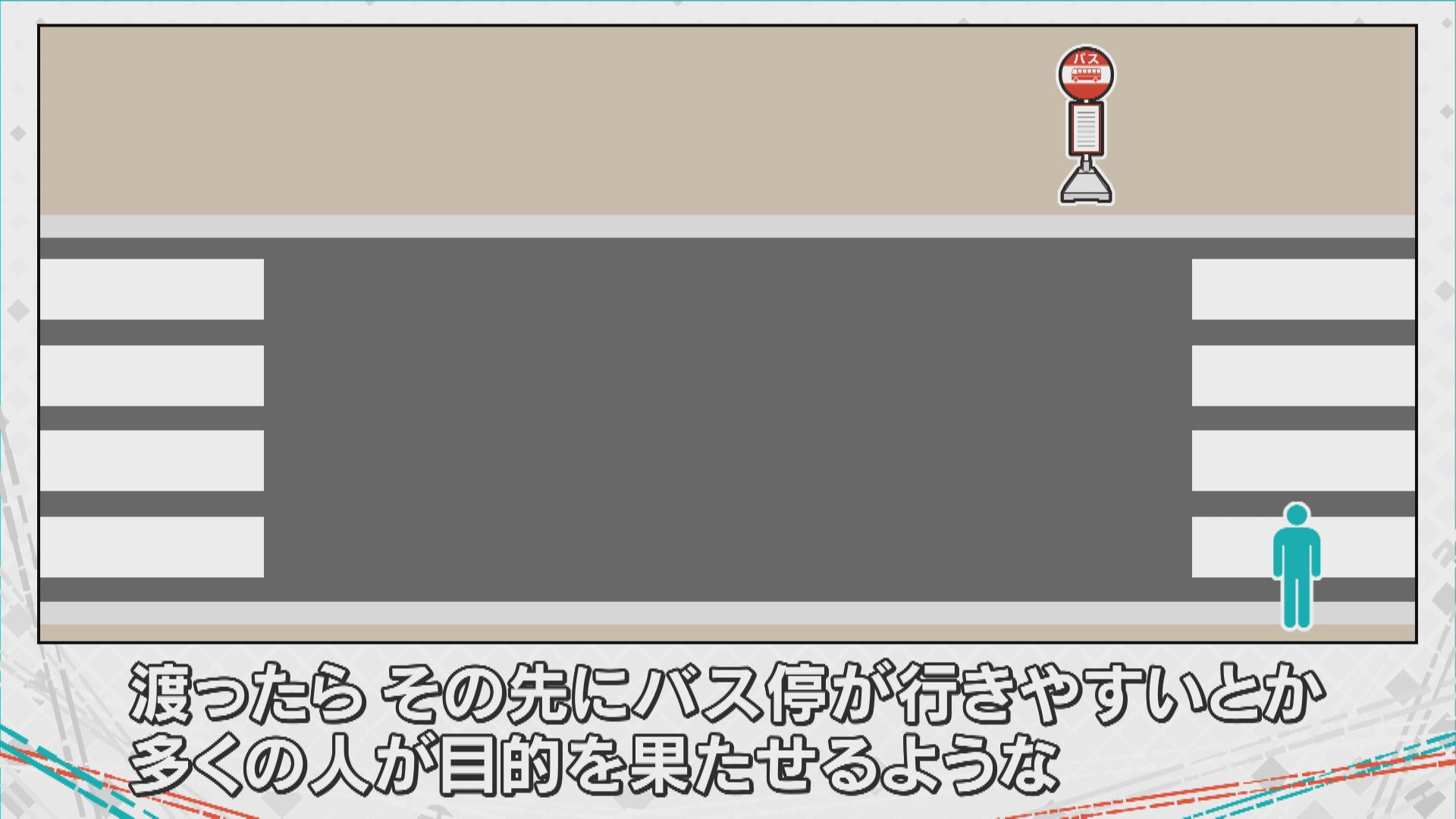 「横断歩道と横断歩道の真ん中にバス停があると、バス停に向かって直接行った方が早いとなってしまうので、渡ったらその先にバス停が行きやすいとか、多くの人が目的を果たせるようなある程度環境を整えることで、人間の行動もコントロールできる」