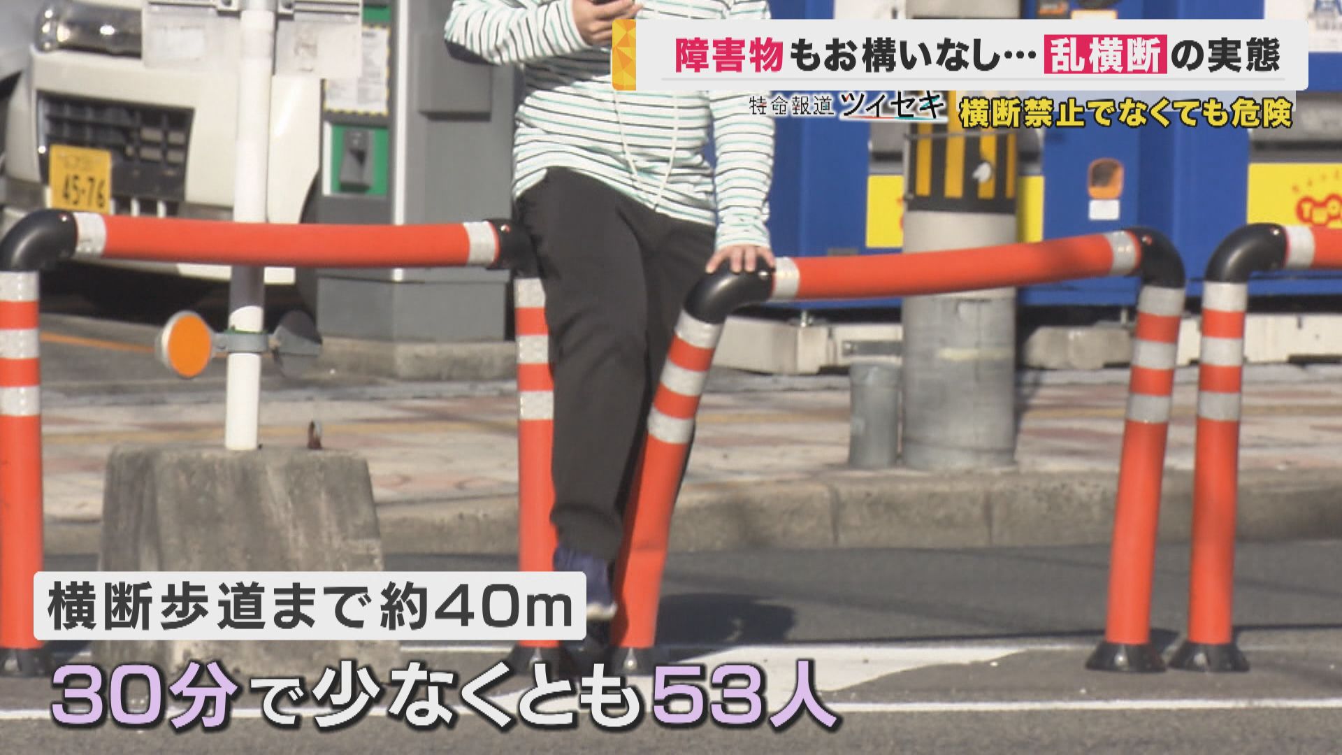 横断歩道までおよそ40メートルの場所で、取材班が調査すると30分で少なくとも53人が車の間をすり抜けて横断していました。