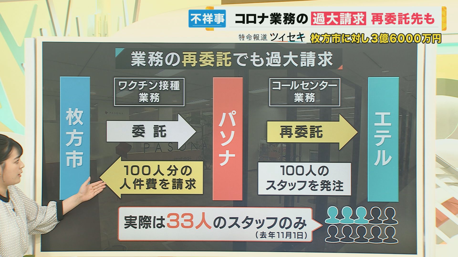 問題が発覚した2022年11月1日は、100人態勢で業務を行うよう発注がかかっていましたが、実際は、わずか33人のスタッフのみで対応していました。100人分の人件費として過大に請求されていたことが、枚方市の発表で分かりました。