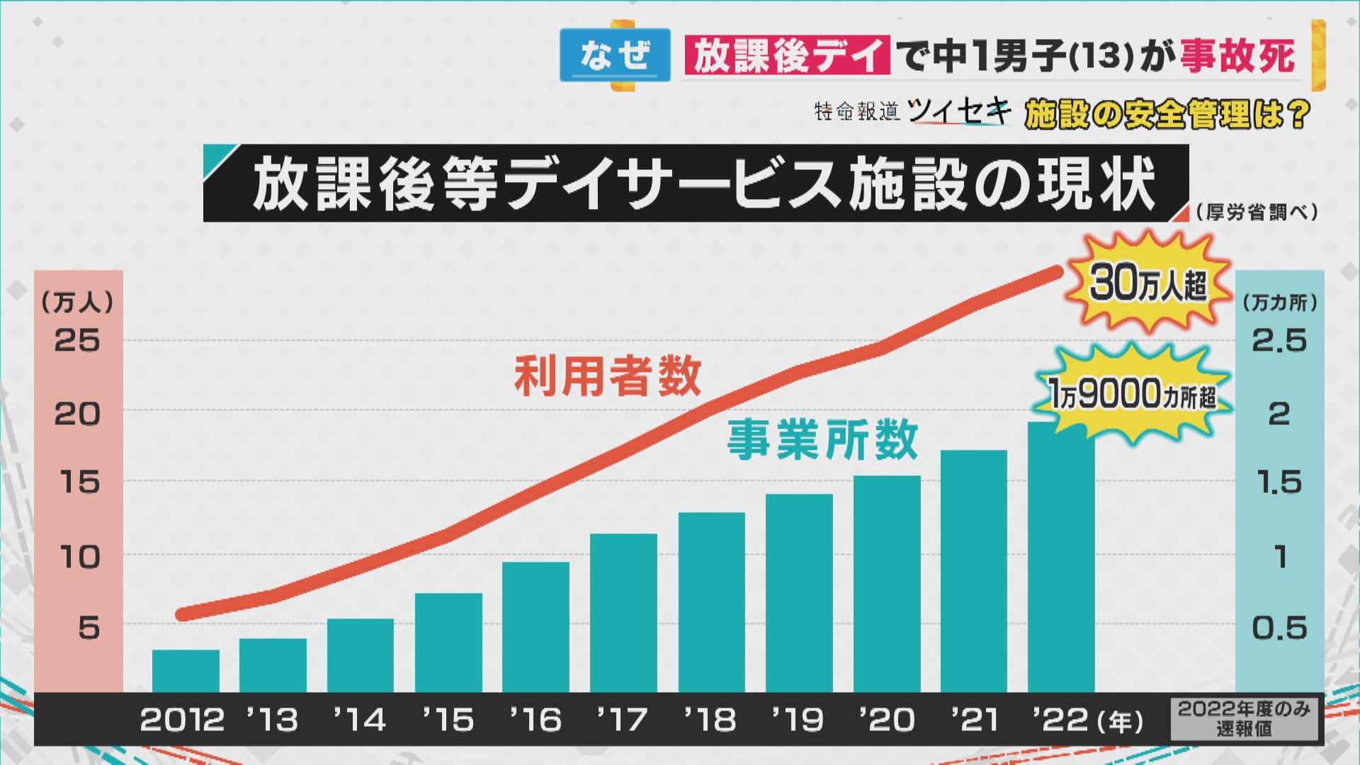 いま、放課後デイサービスは増加の一途をたどっています。2012年に制度ができてから施設に通う子どもの数も年々増加し、今では利用者が30万人を超え、事業所の数も1万9000カ所に上っています。